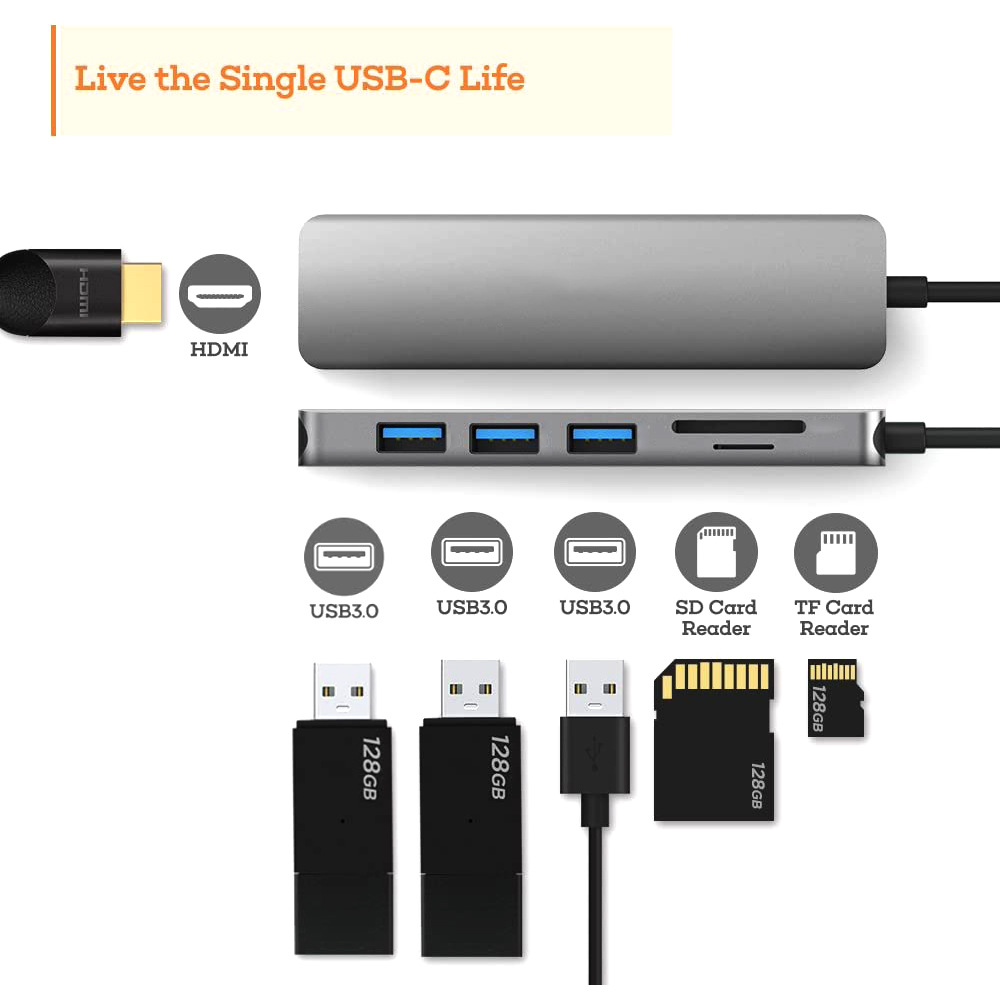 6in1 USB Type C Hub Adapter with 4K HDMI Multiport Card Reader USB3.0 SD TF PD