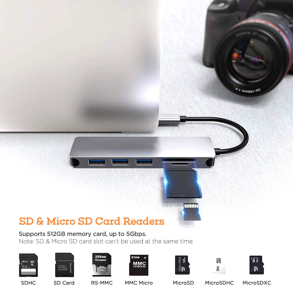 [All-in-one USB C hub]-CUDNY 6-in-1 USB Type C hub includes Type C PD charging port, 2 USB 3.0 ports, 4K HDMI video output, Micro SD and TF card reader. The SD card slot and TF card slot can be used on the hub at the same time, and the appearance is extremely compact and stylish.