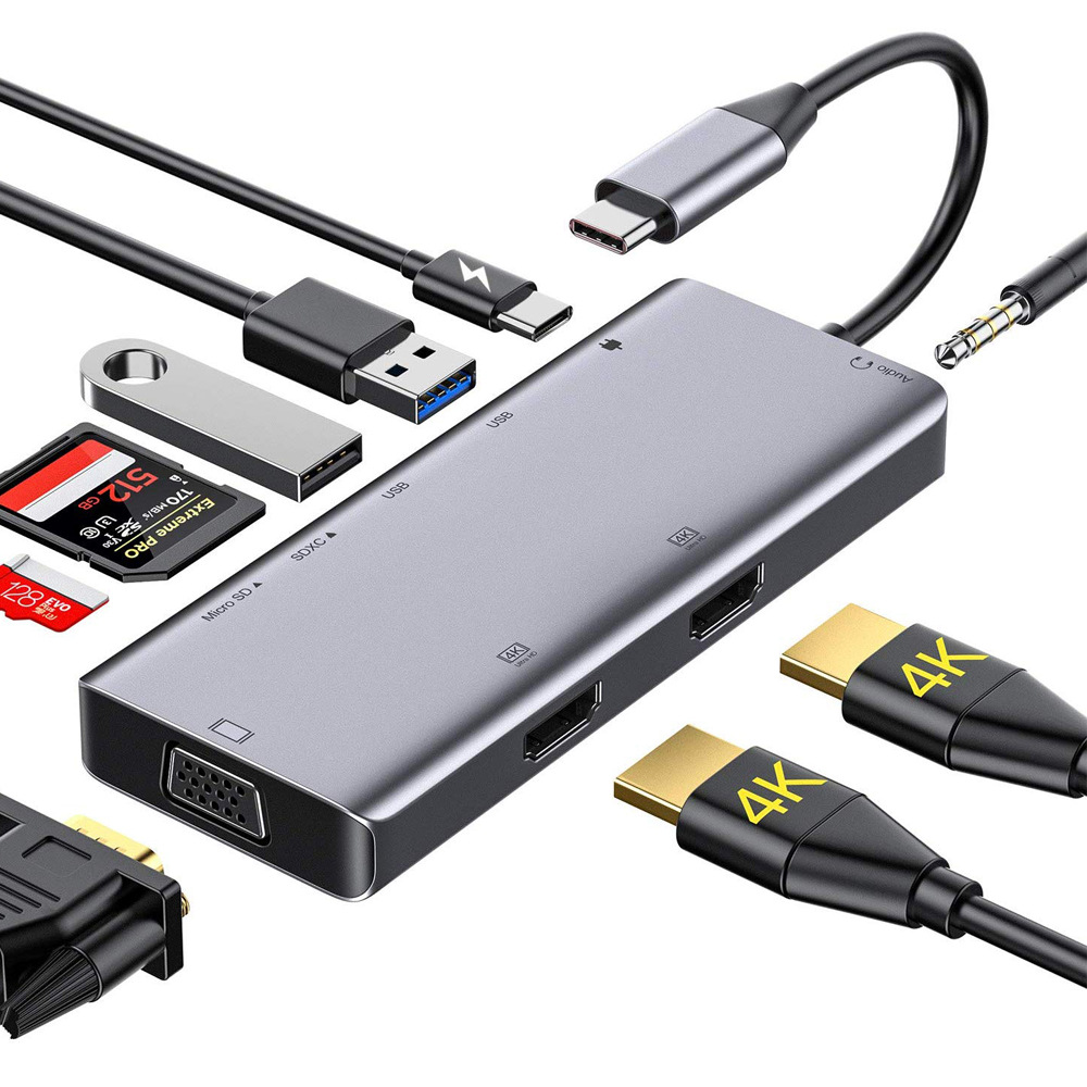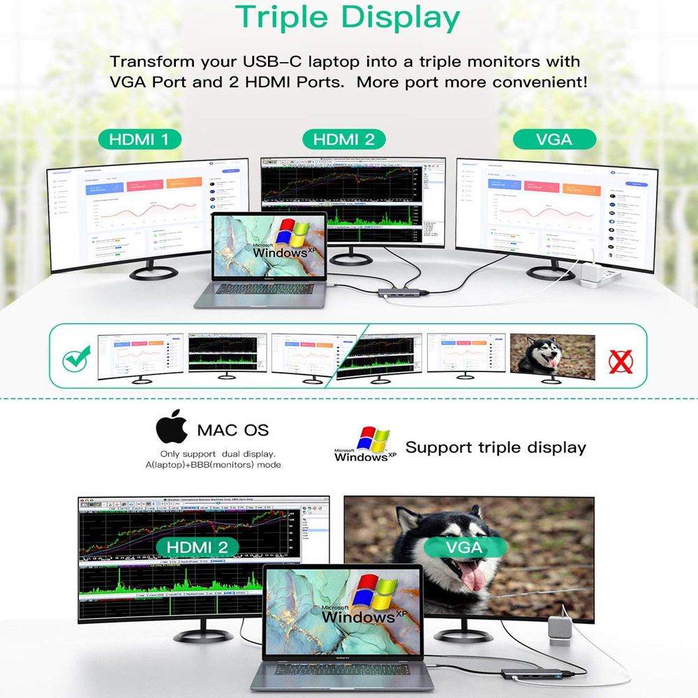 [Three-screen docking station] Windows system usb-c laptop supports three-screen. Mirror or extend the screen through the USB C to HDMI and VGA ports, and transmit 4K UHD or Full HD 1080p video to a high-definition TV, monitor, easily satisfy your daily use, and effectively work in games, work and entertainment (���� Note: The three displays are an HDMI output display, an HDMI+VGA display, and a laptop screen.)