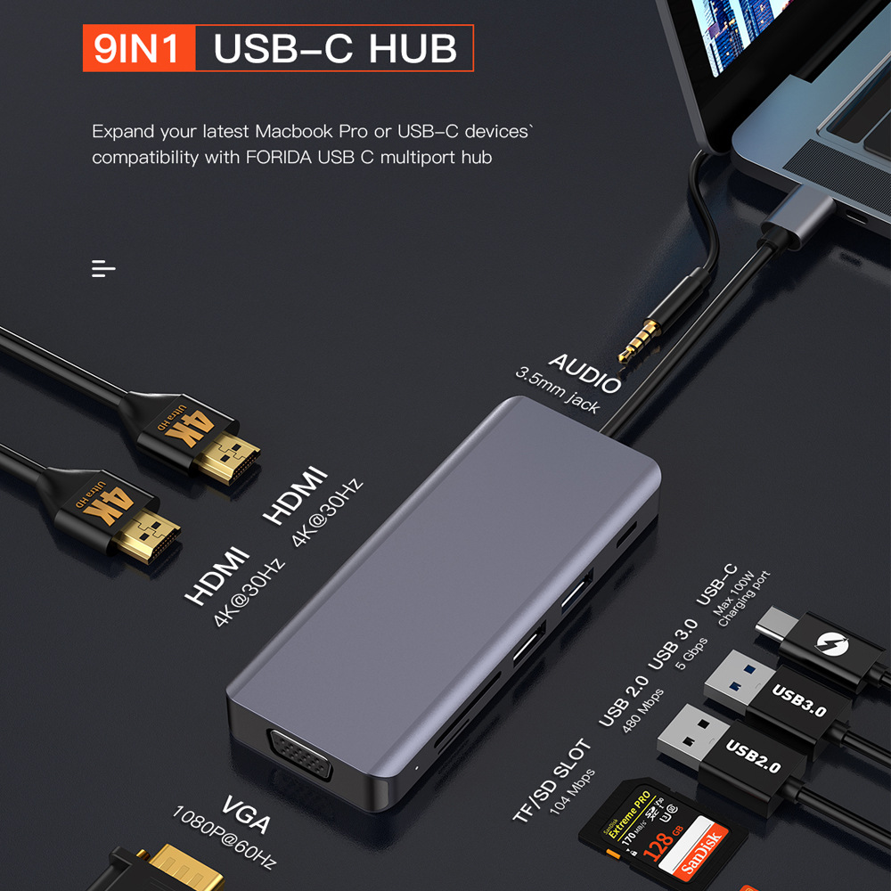 [Dual HDMI USB C hub] Before purchasing, please make sure that the type c Thunderbolt 3 port of the laptop supports power supply and multi-monitor display. Mac OS system laptops do not support MST (multi-streaming), and only mirror one screen to another instead of expanding to two separate screens. (����Note: It is not supported to connect our hub to the usb port of the laptop through a USB to USB C adapter)