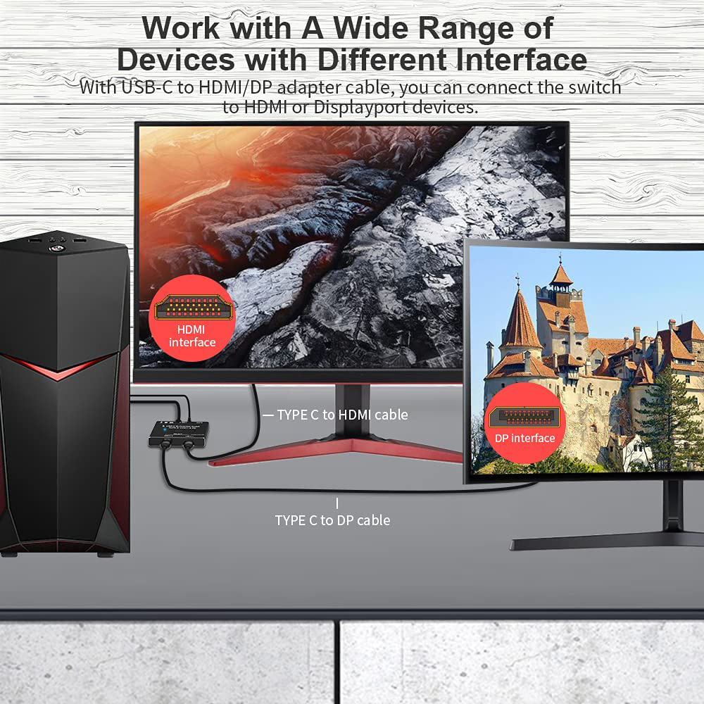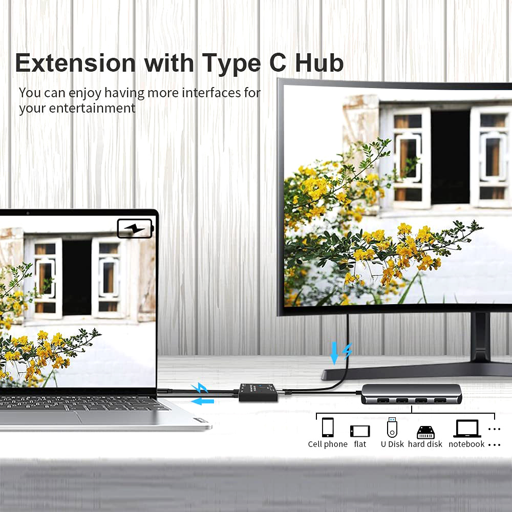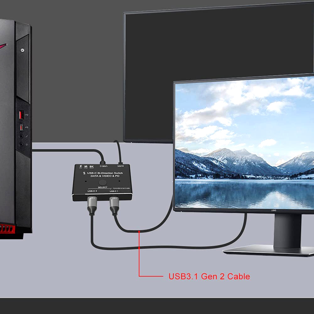 It is very important that you have a USB C Gen-2 cable to ensure the video output on the monitor. 8K USB-C two-way video streaming and data and power switch. The USB-C switch allows you to connect two USB-C sources to a USB-C monitor or connect a USB-C source to switch between the two monitors (two monitors cannot display at the same time), both from your source and USB- They support alternate mode DP on C port. Video streaming. Clear 8K video experience