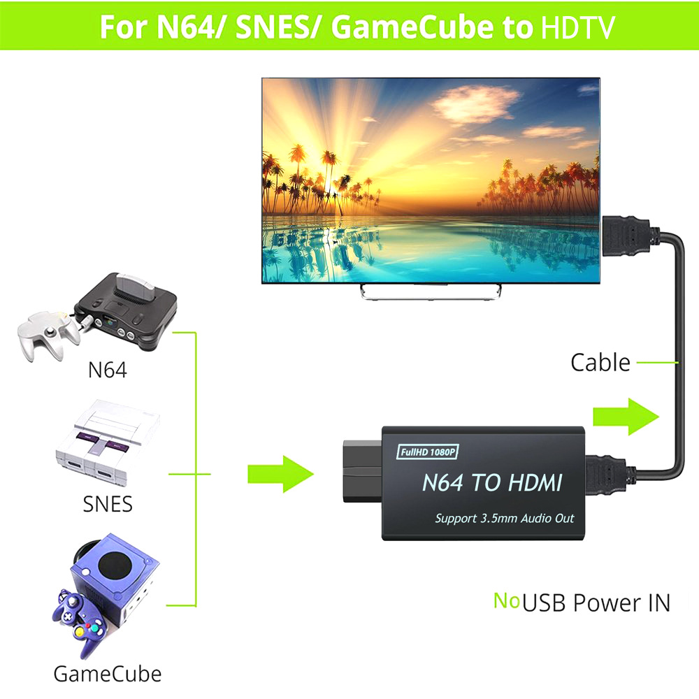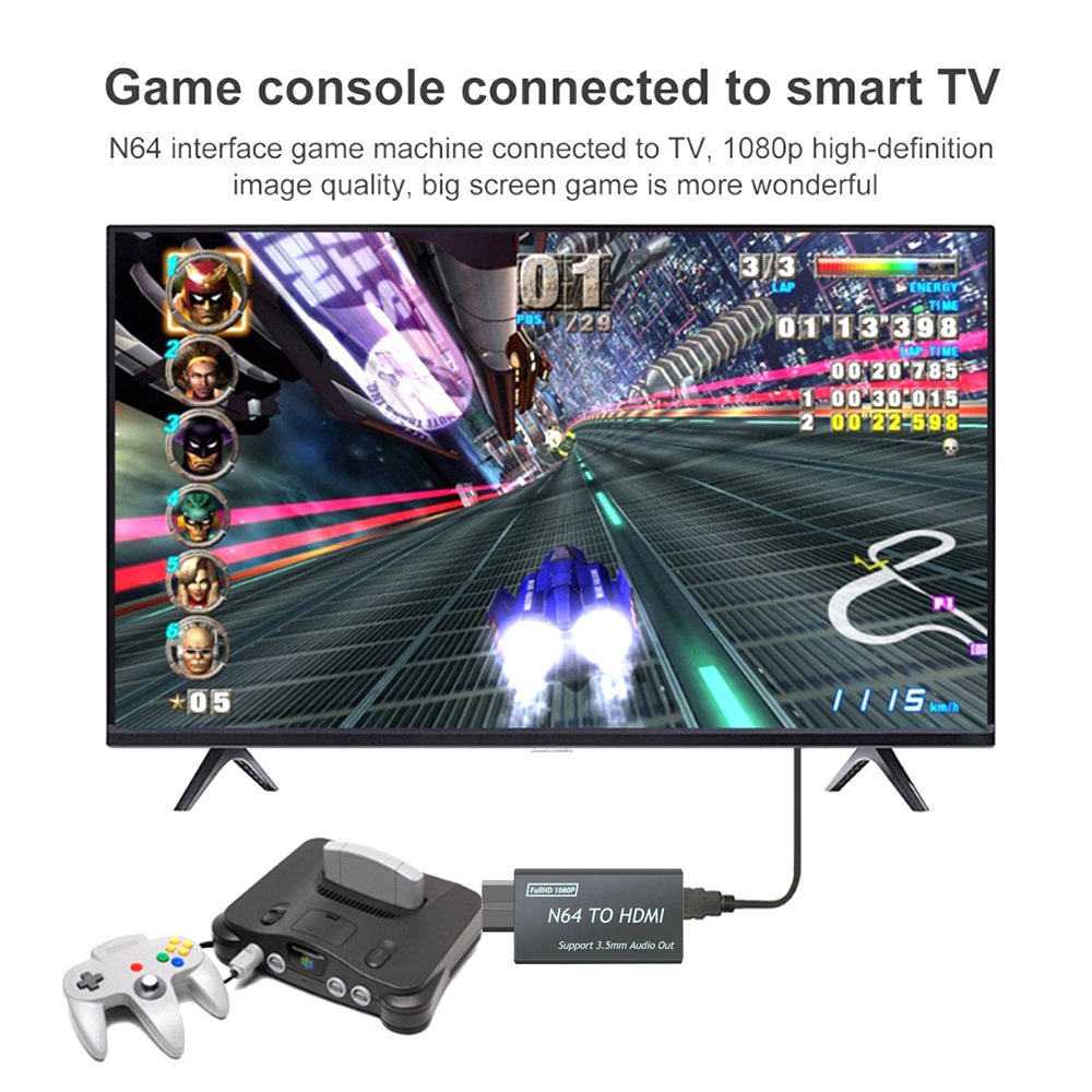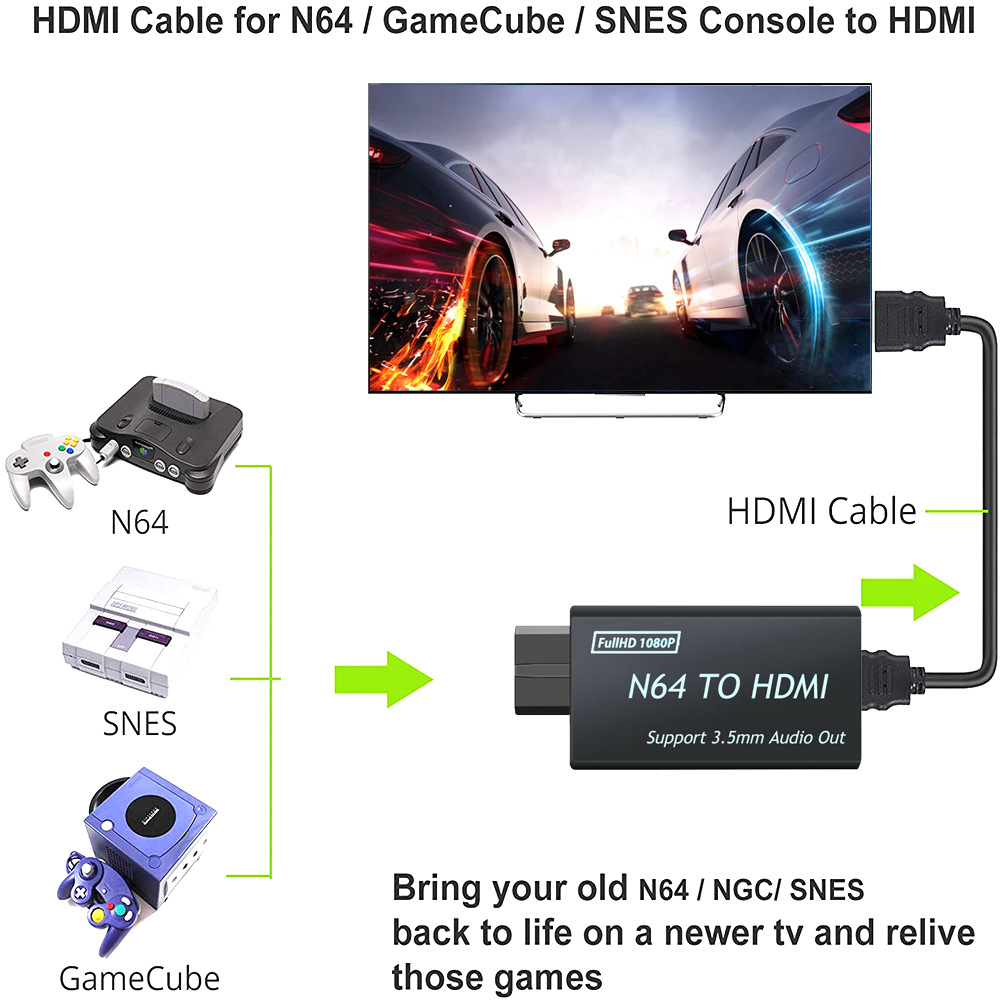 This Nintendo 64 to HDMI converter makes it easy to connect the Nintendo 64 console to the new HDMI TV input, eliminating cable confusion.