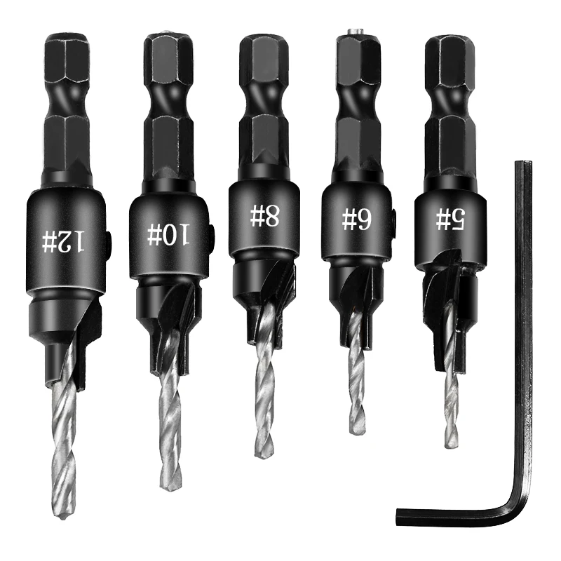 Four piece set includes bits for drilling pilot holes for screw sizes #5, #6,#8,#10 and #12