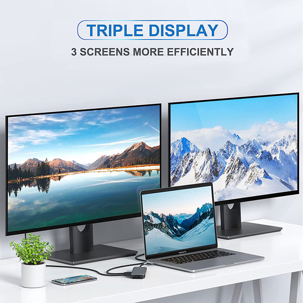[Portable 10 in 2 USB-C Hub] is specially designed for MacBook Pro 2020 2019 2018 2017 2016 and MacBook Air 2020 2019 2018. Advanced chips expand your job opportunities and provide you with more stable performance. No driver or software is required, just plug and play. Convert your MacBook USB C port to 10 ports: 2x4K 60Hz hdmi, vga, 3xusb, SD/TF card reader, 100W pd, 3.5mm
