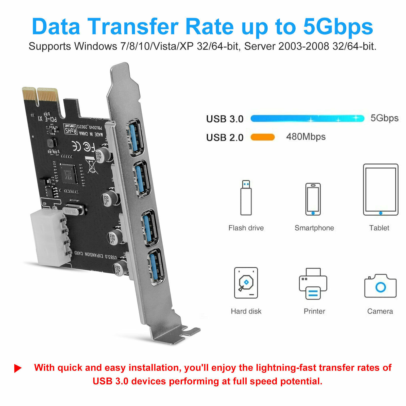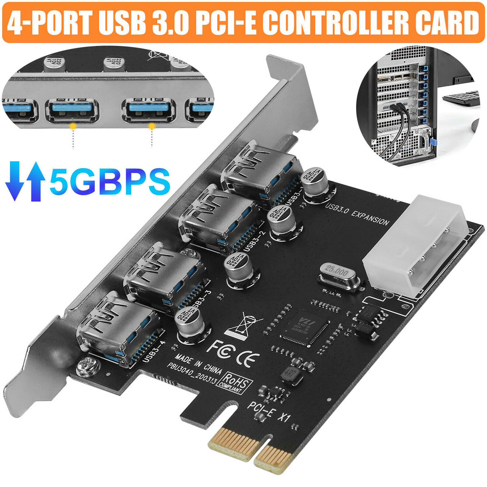 4-port PCI-E to USB 3.0 hub PCI Express expansion card adapter at 5 Gbps speed