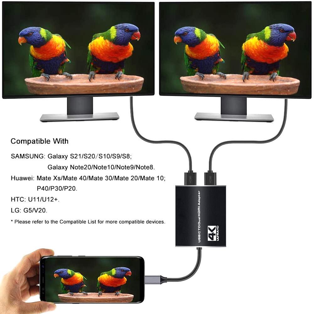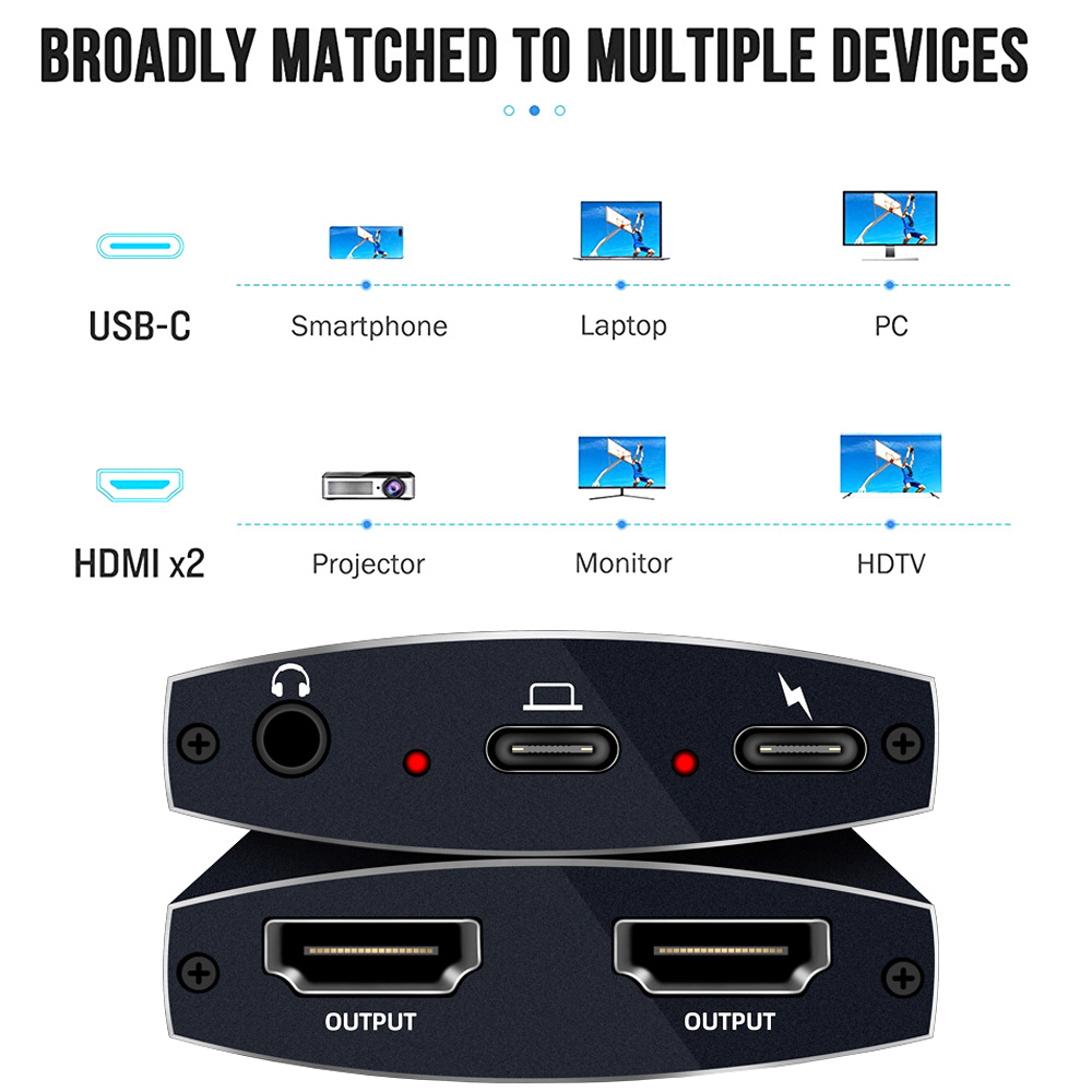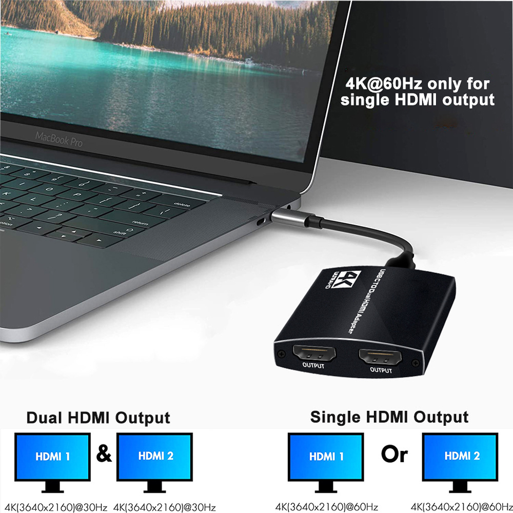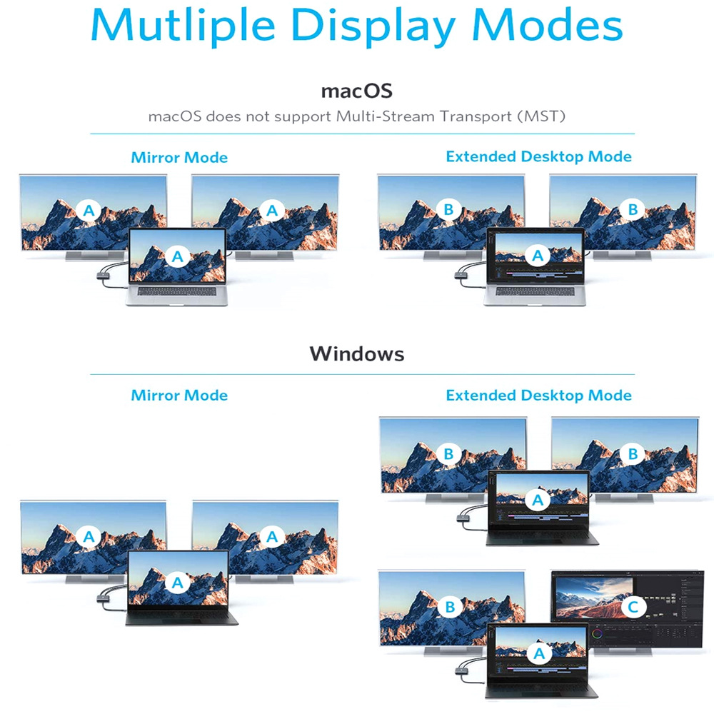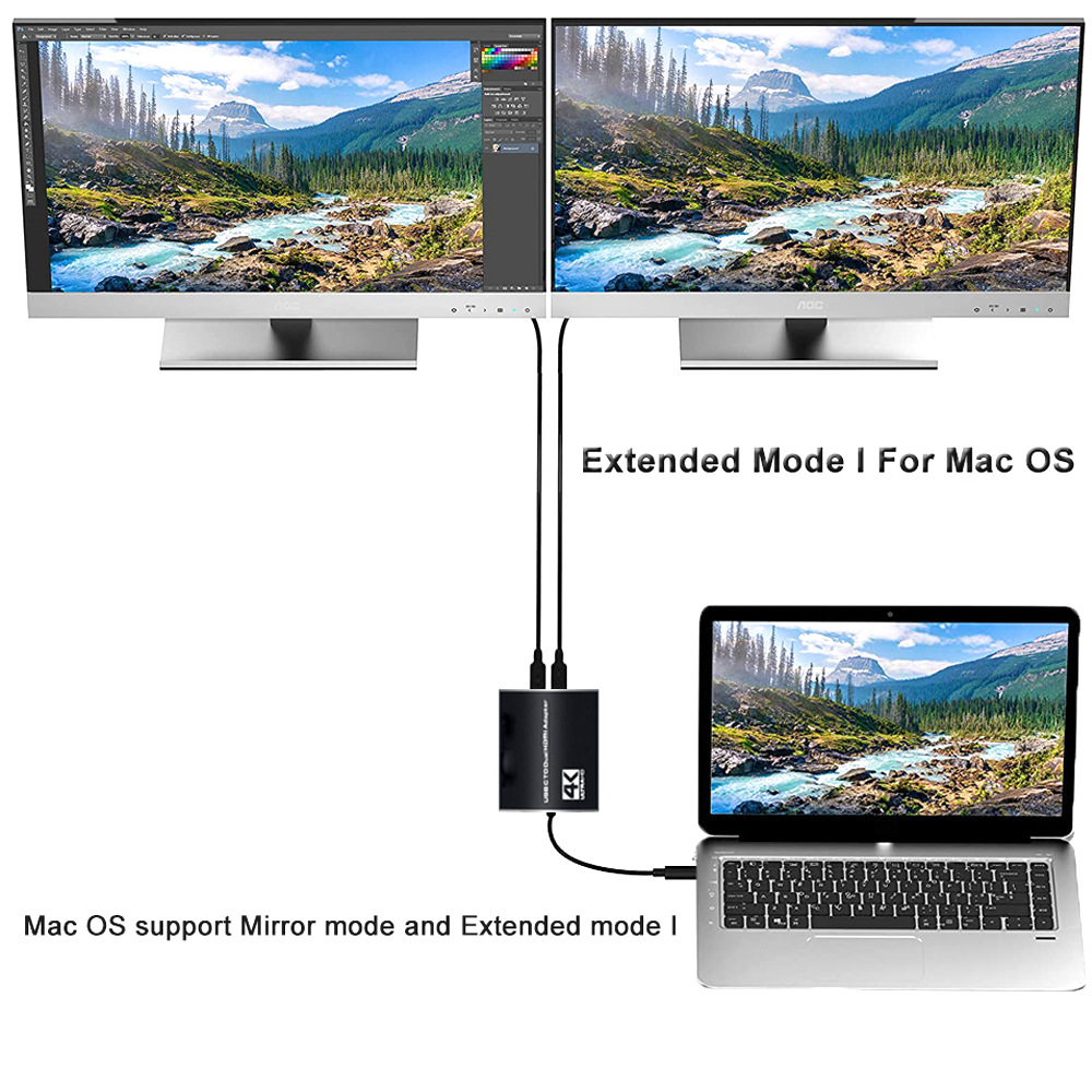 USB-C to Dual HDMI Adapter 2 in 1: ️Note: For Mac OS, it is a mirroring mode. Due to the limitation of Mac OS, two different screens cannot be expanded; there will be a USB Type C (tunderbolt 3) port The device is connected to two external monitors with 4K HDMI output; you can enjoy movies and games with your family on the external HD screen; Windows operating system supports both SST and MST modes, if you are not sure how to set up, please contact us, Or download the manual in product information -> product information.