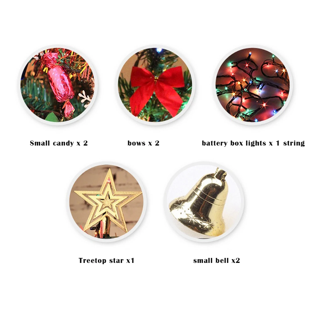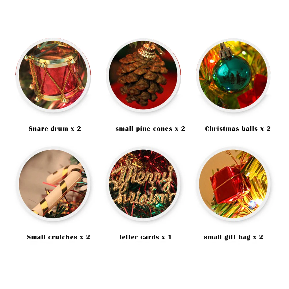 1.In the accessories, the color of the small drum/Christmas ball/small cane/candy/small gift bag is random, the small bell, the letter plate itself has a small hole, and there is no lanyard, just insert it on the branch.