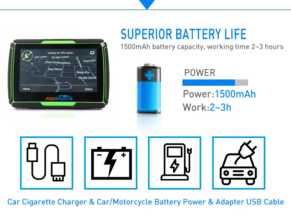 Power Source: Rechargeable Lithium Battery or Car Cigarette Charger or Car/Motorcycle Battery Power