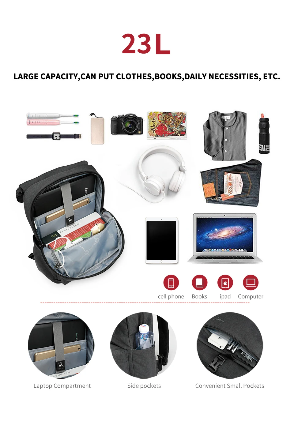 3. Charging backpack with external USB charging port design