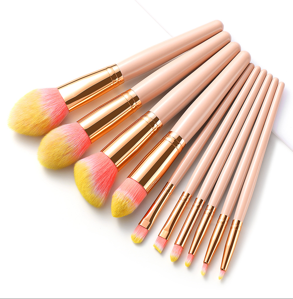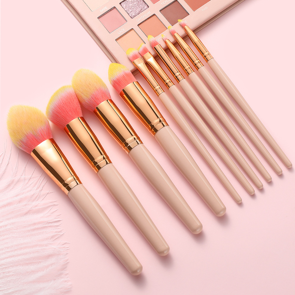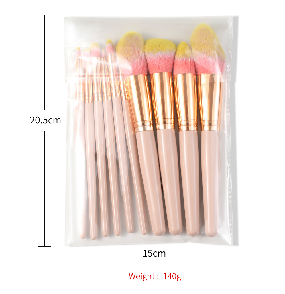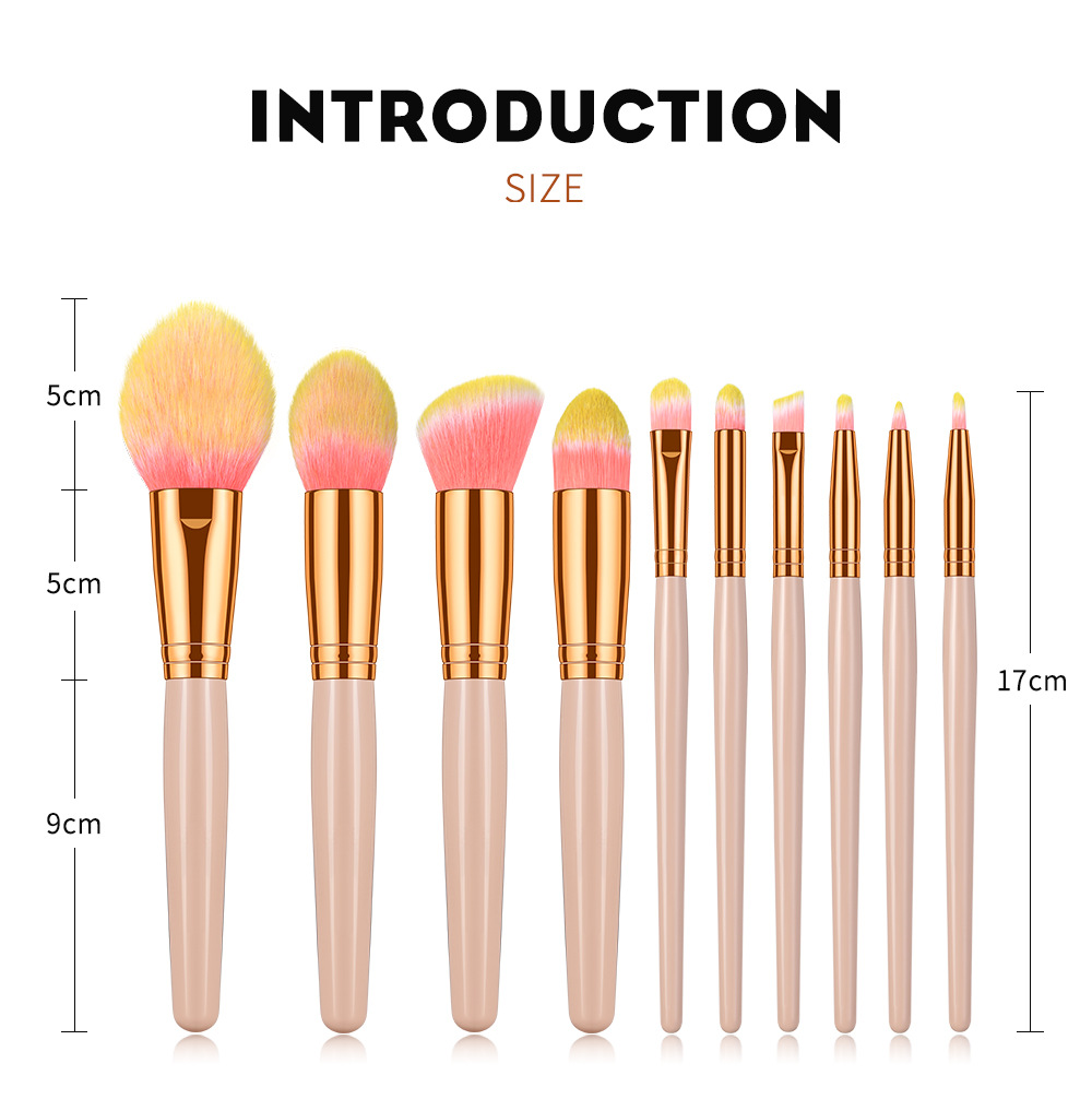 10 makeup brushes set Size: 19*5CM Material: wooden handle/aluminum tube/fiber wool Packing: opp bag Color: picture color Box gauge: 50*40*40cm QTY: 150PCS