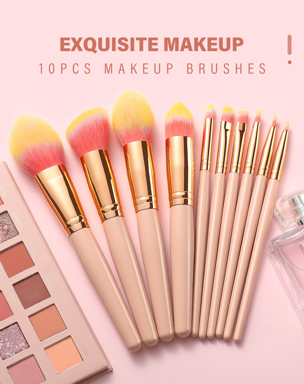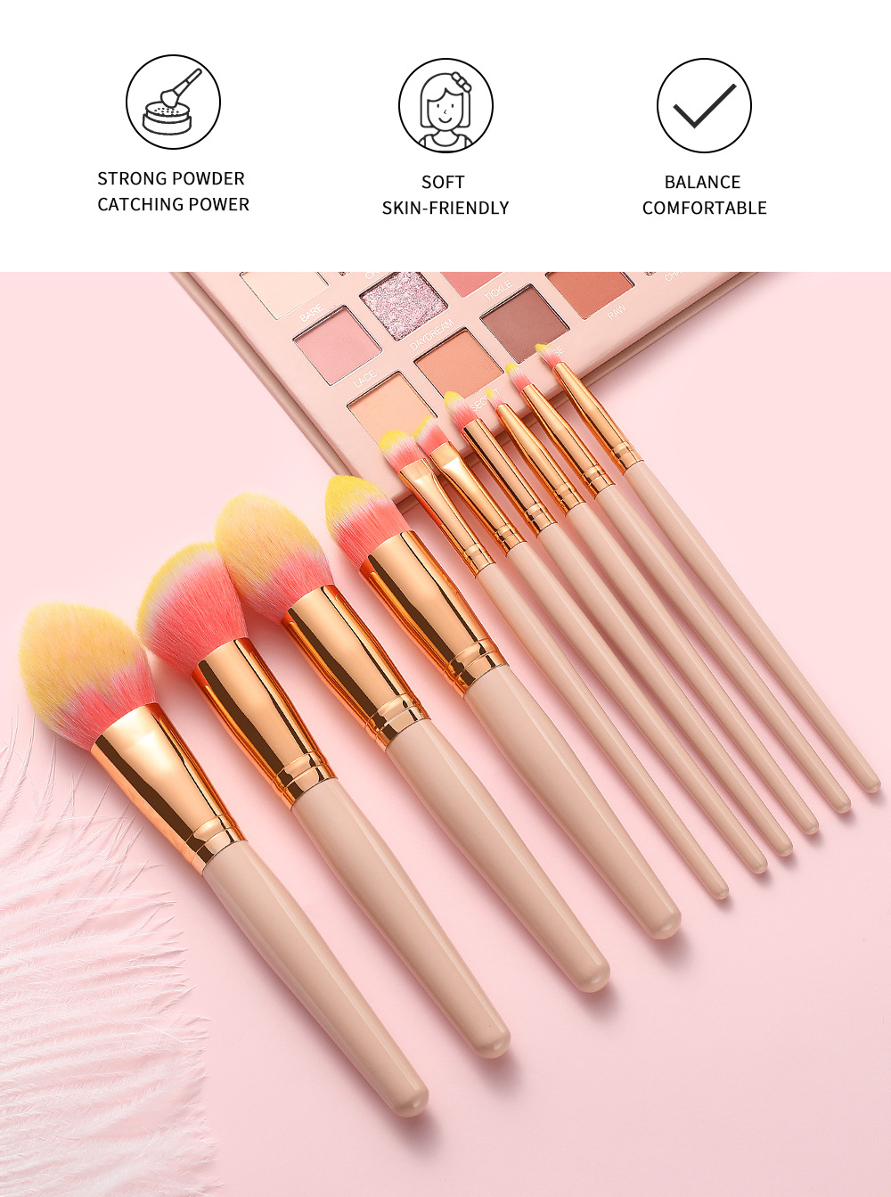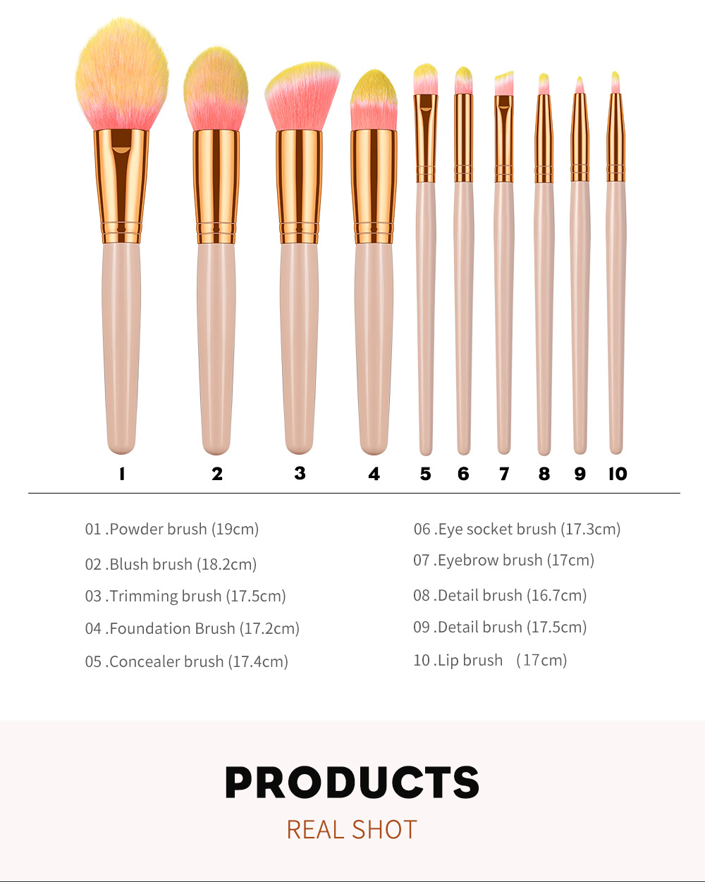 10 makeup brushes set Size: 19*5CM Material: wooden handle/aluminum tube/fiber wool Packing: opp bag Color: picture color Box gauge: 50*40*40cm QTY: 150PCS