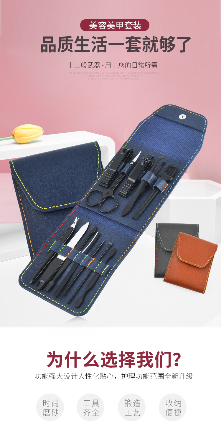 12-piece manicure tool set Size: 11*8.5CM Material: stainless steel + PVC Packing: PU leather Color: gray, blue, brown Box gauge: 48.5*27.5*28.5CM QTY: 200PCS