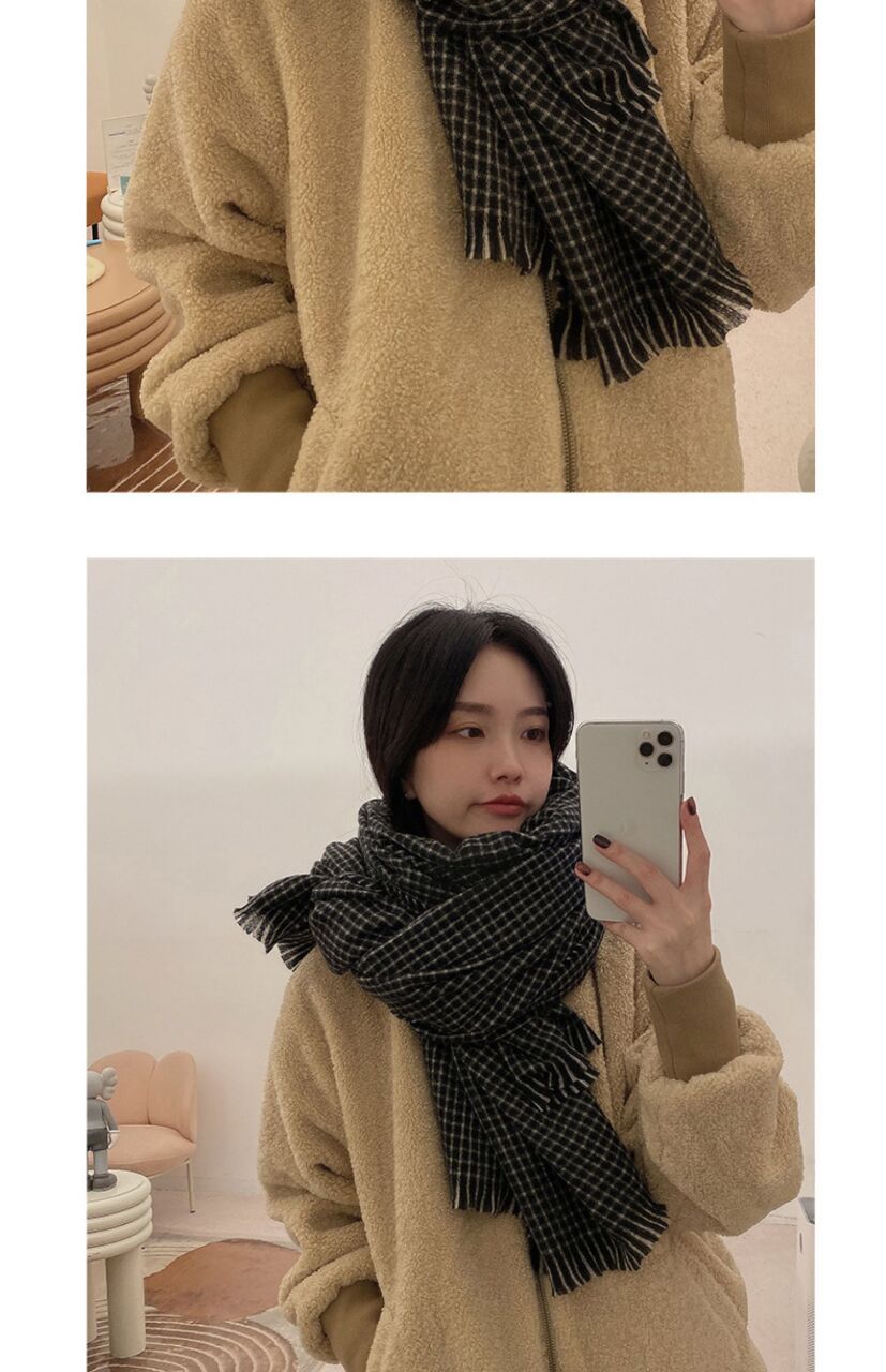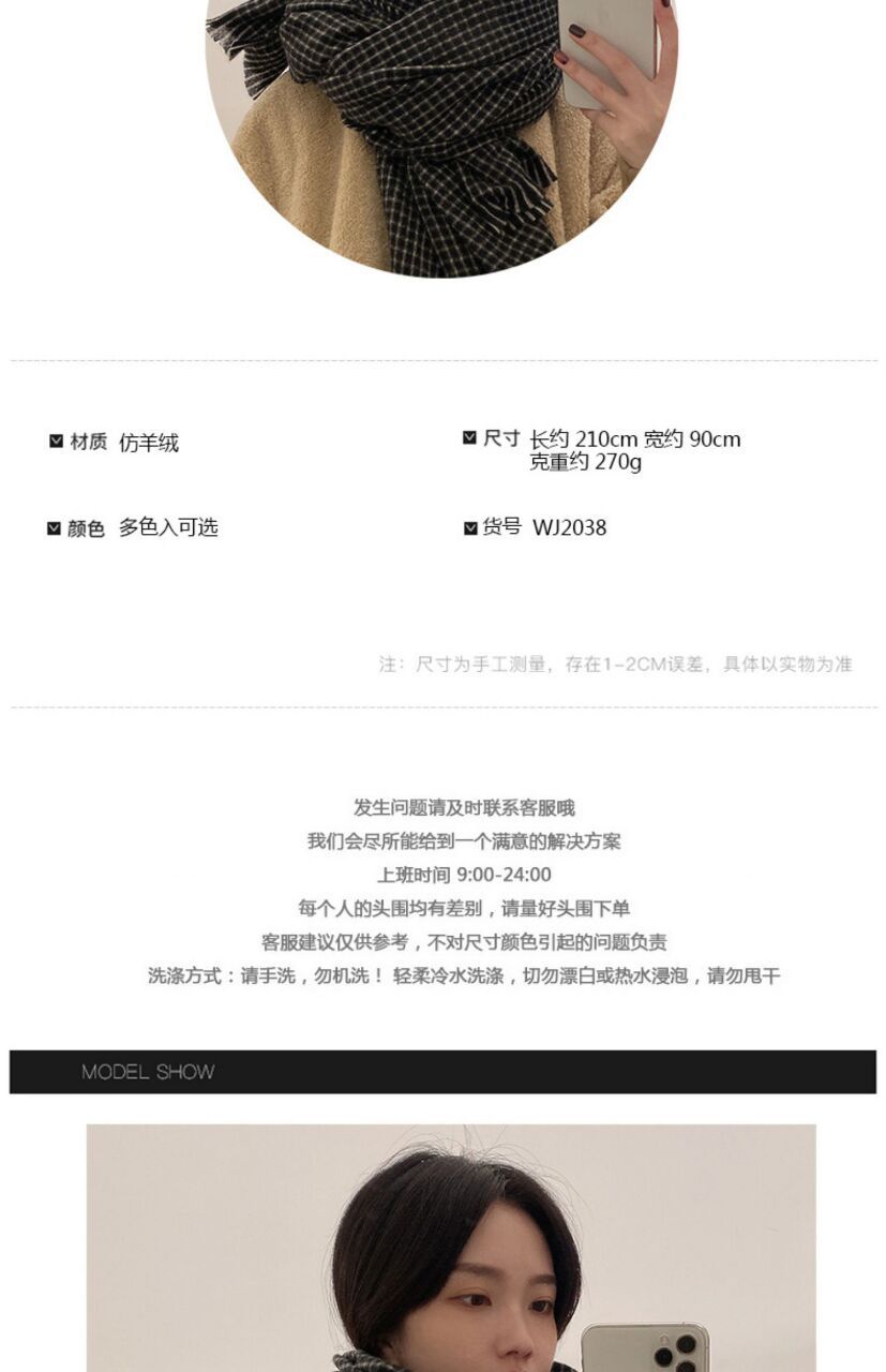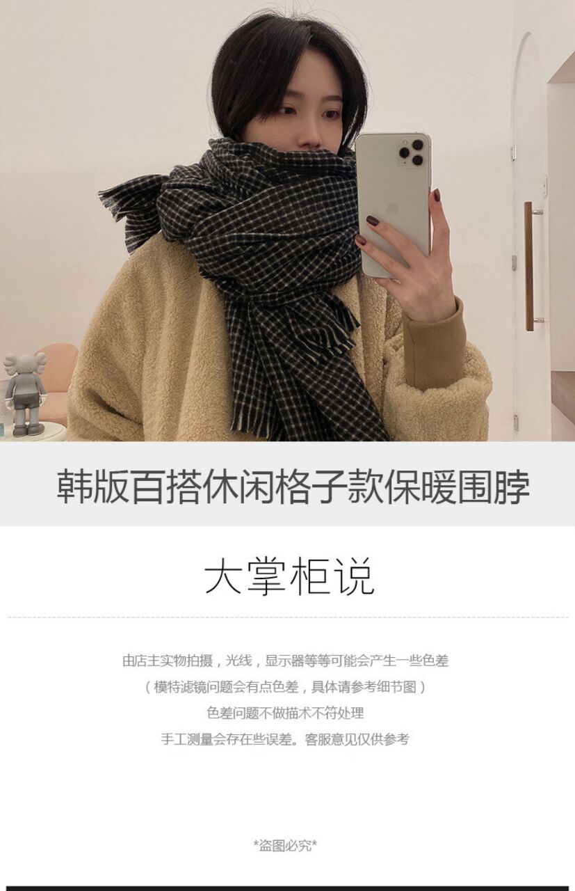 Women’s black plaid scarf Size: 210*90CM Gram weight: 270g Material: imitation cashmere Packing: OPP bag Color: multi-color optional