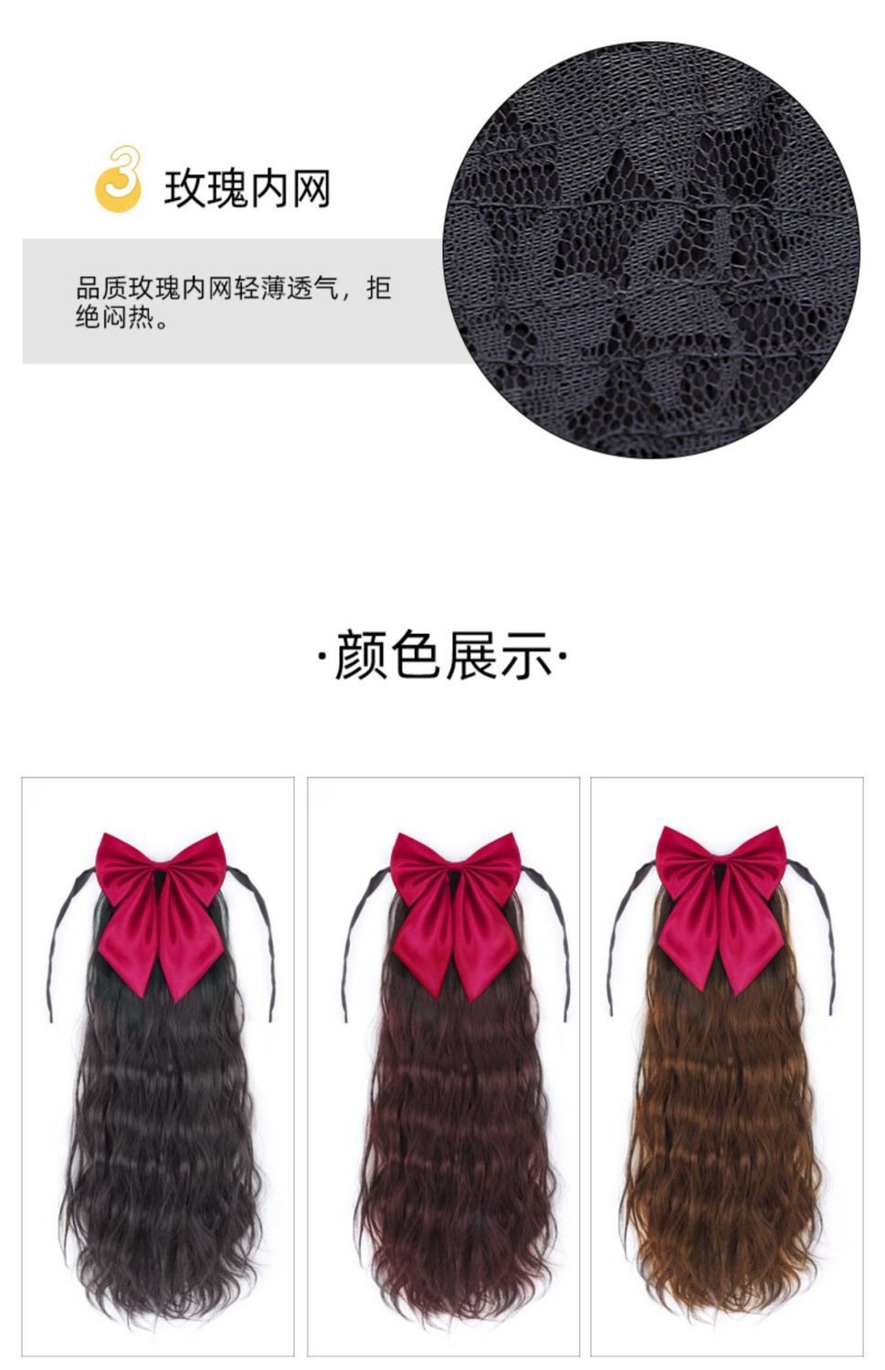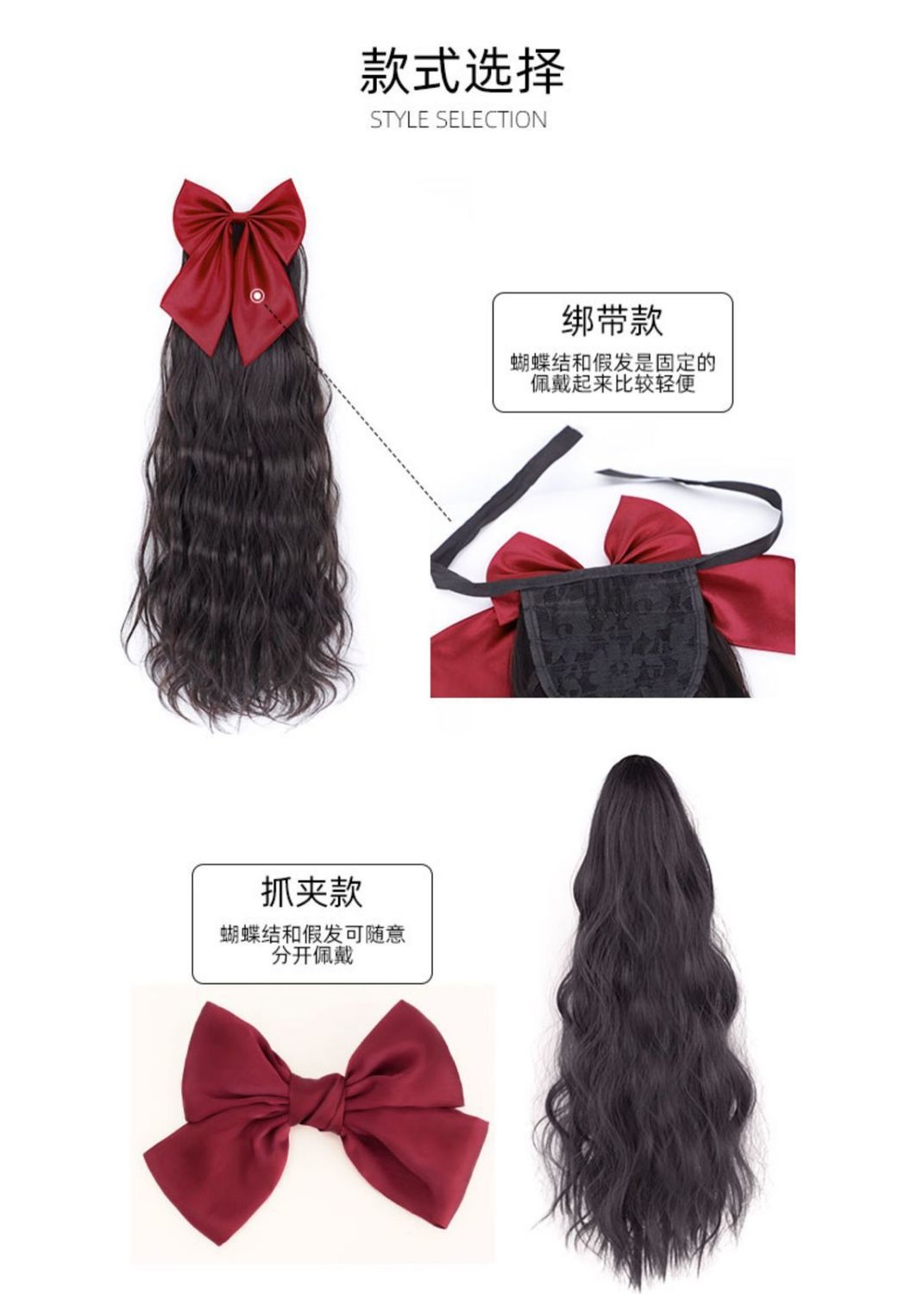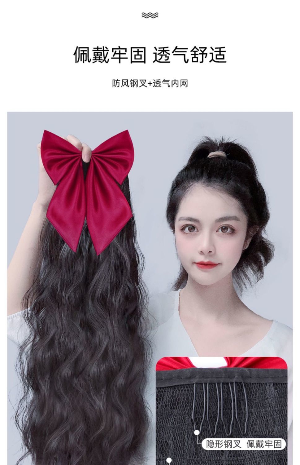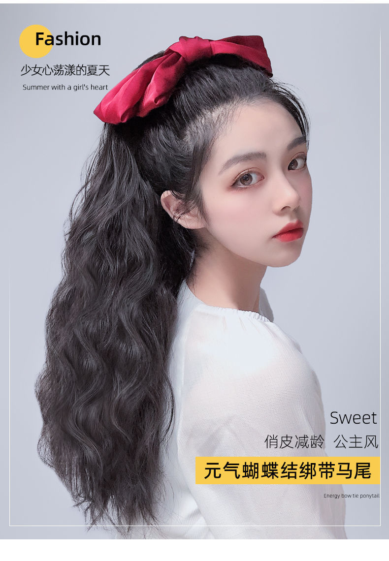 Bow ponytail wig Size: Length 55CM Material: Mixed silk hair Packing: OPP bag Color: mixed color