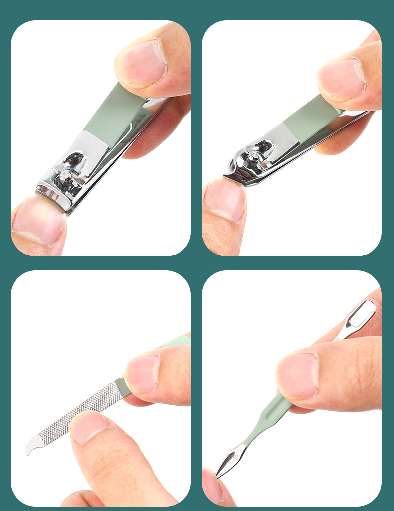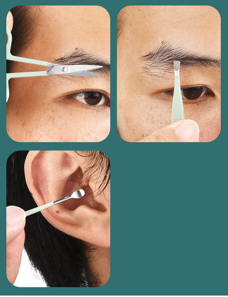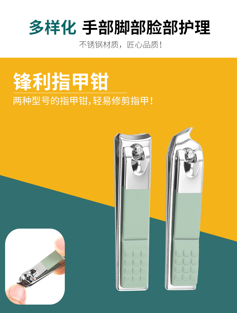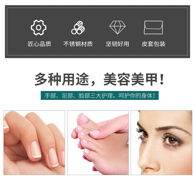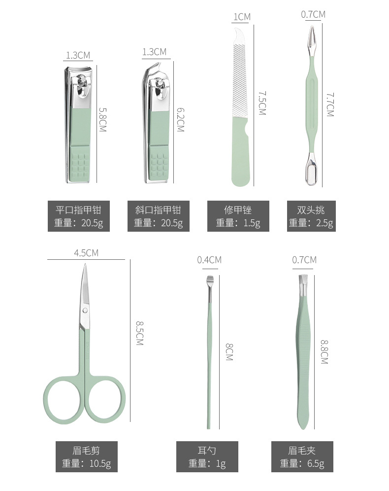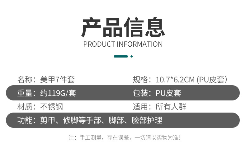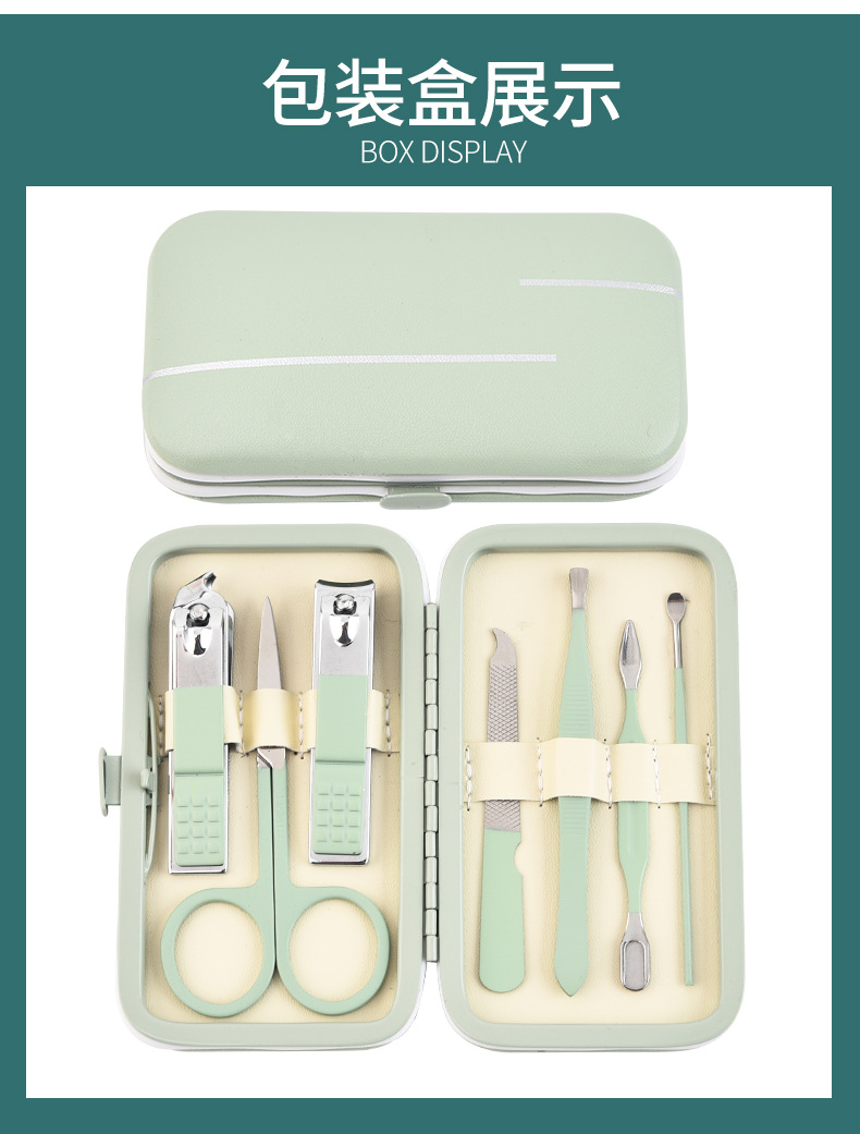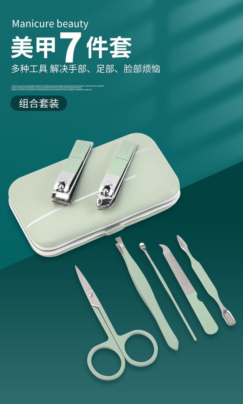 7-piece nail tool set Size: 10.7*6.2CM (PU leather case) Material: Stainless steel Packing: PU leather case QTY: 150PCS