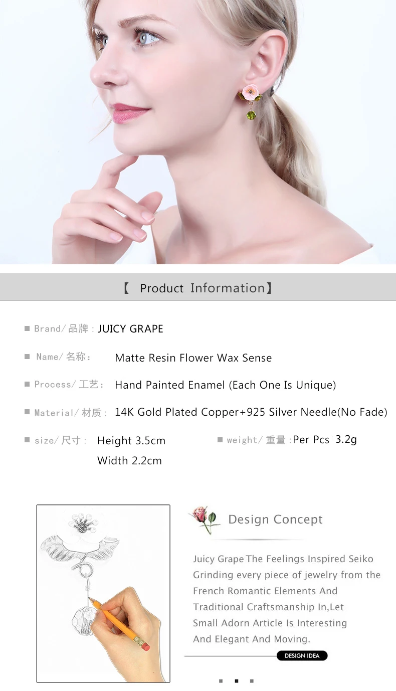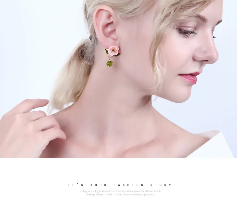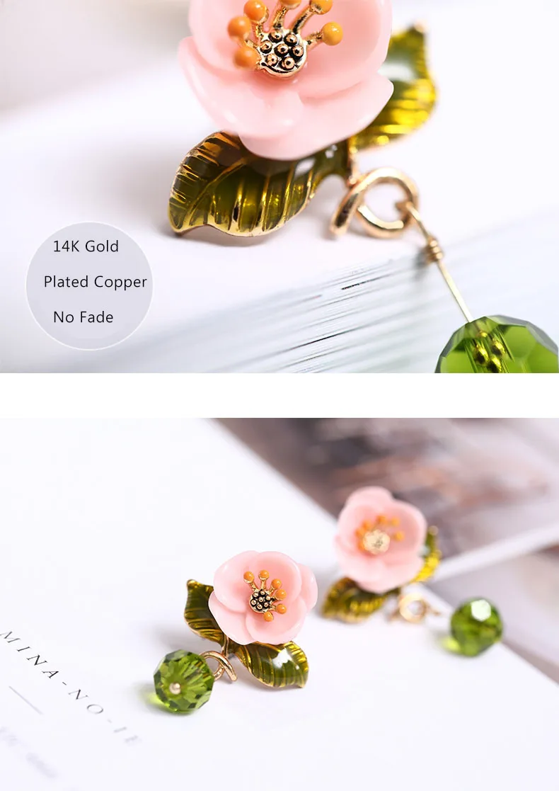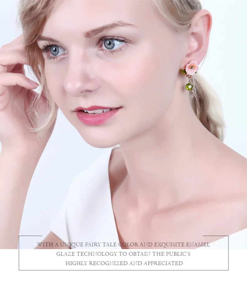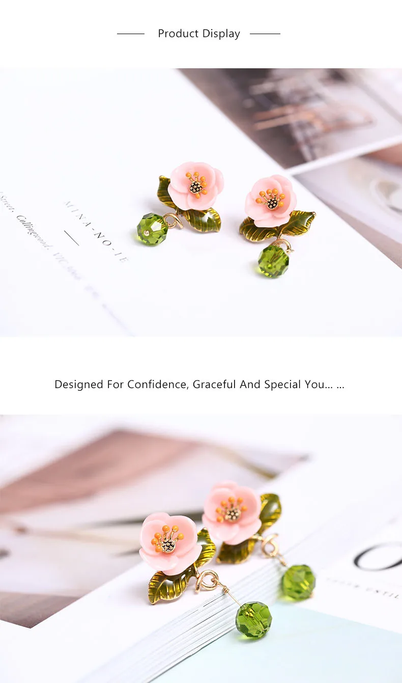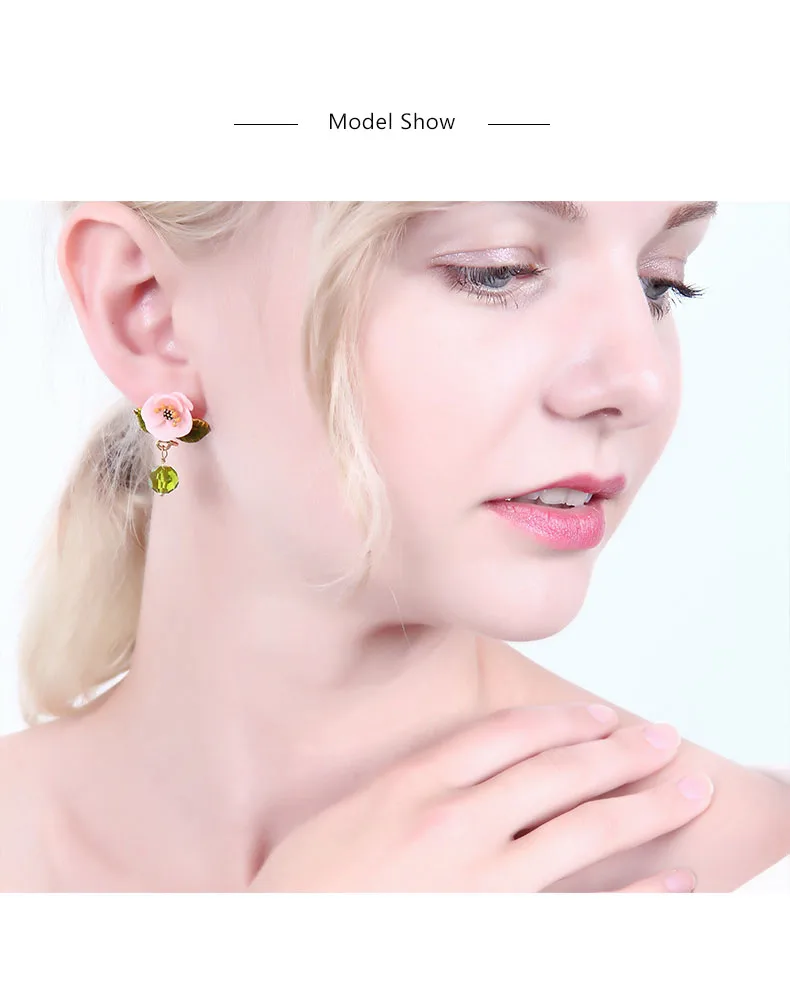 Juicy Grape Enamel Glaze Pink Resin Flower Earrings Green Leaf Glass Crystal Desensitization Copper Gilded for Women