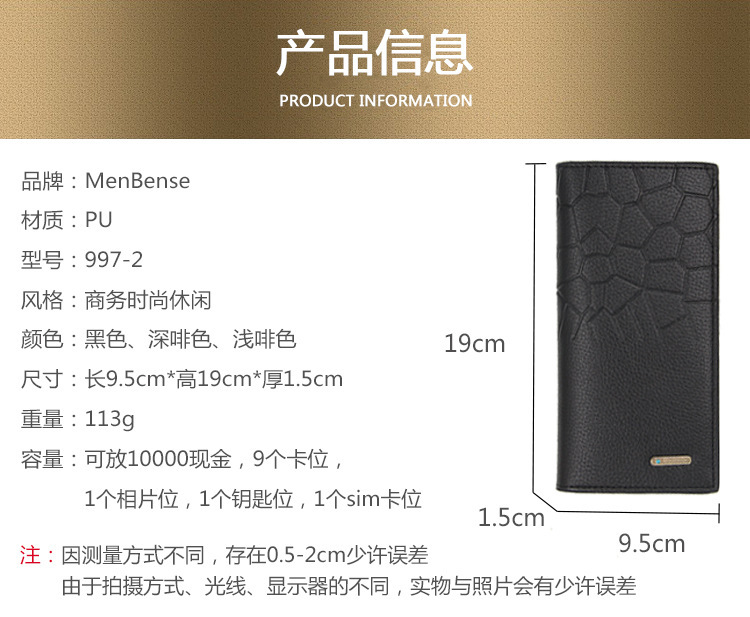 Men’s Fashion Long Wallet Size: 19*9.5*1.5CM Material: PU leather Packing: opp bag Color: three colors available Carton specifications: 55*43*39CM QTY: 150PCS