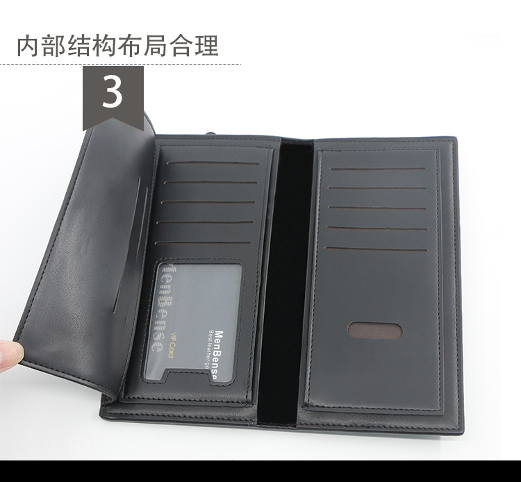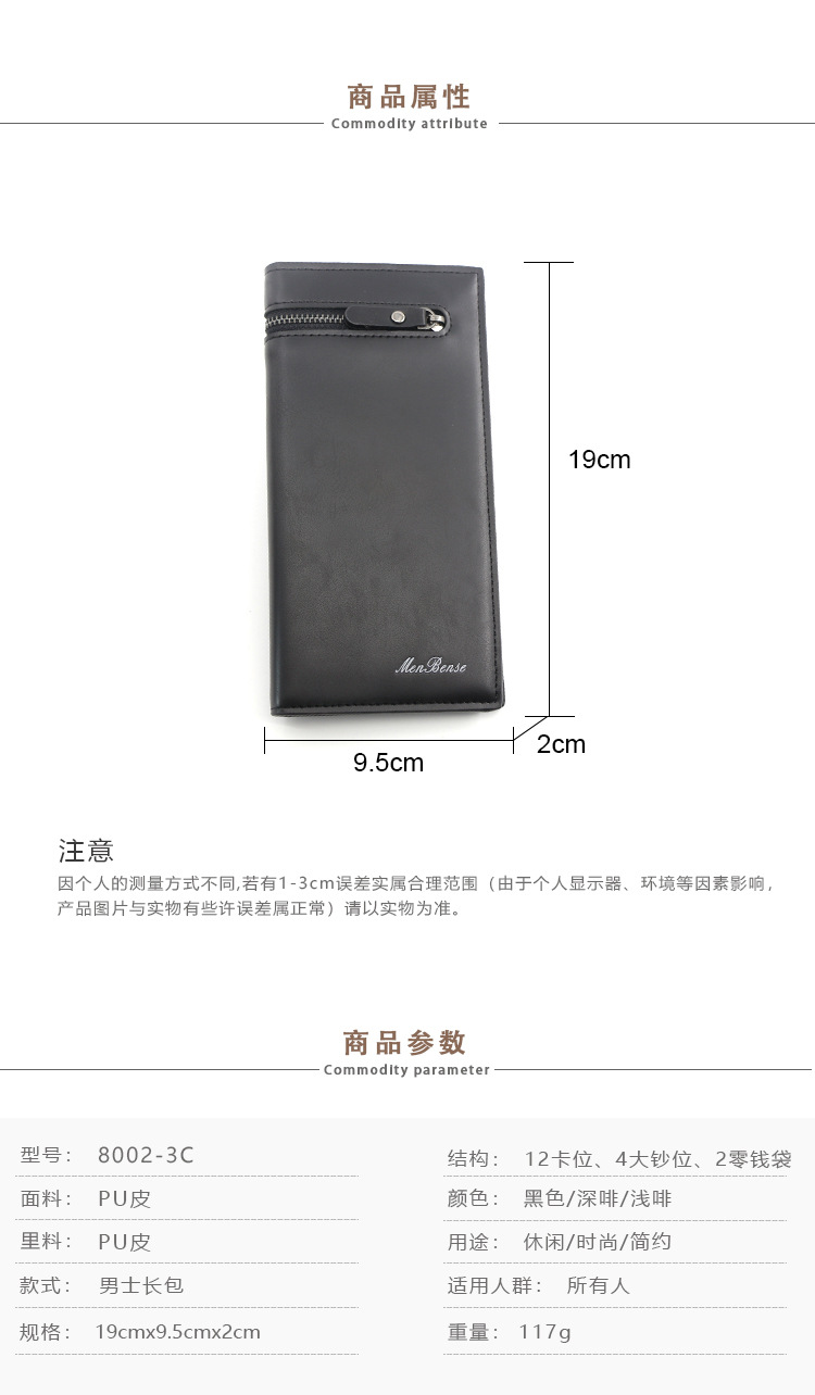 Men’s long wallet casual Size: 19*9.5*2CM Material: PU leather Color: black, dark coffee, light coffee Carton specifications: 55*43*39CM QTY: 150PCS