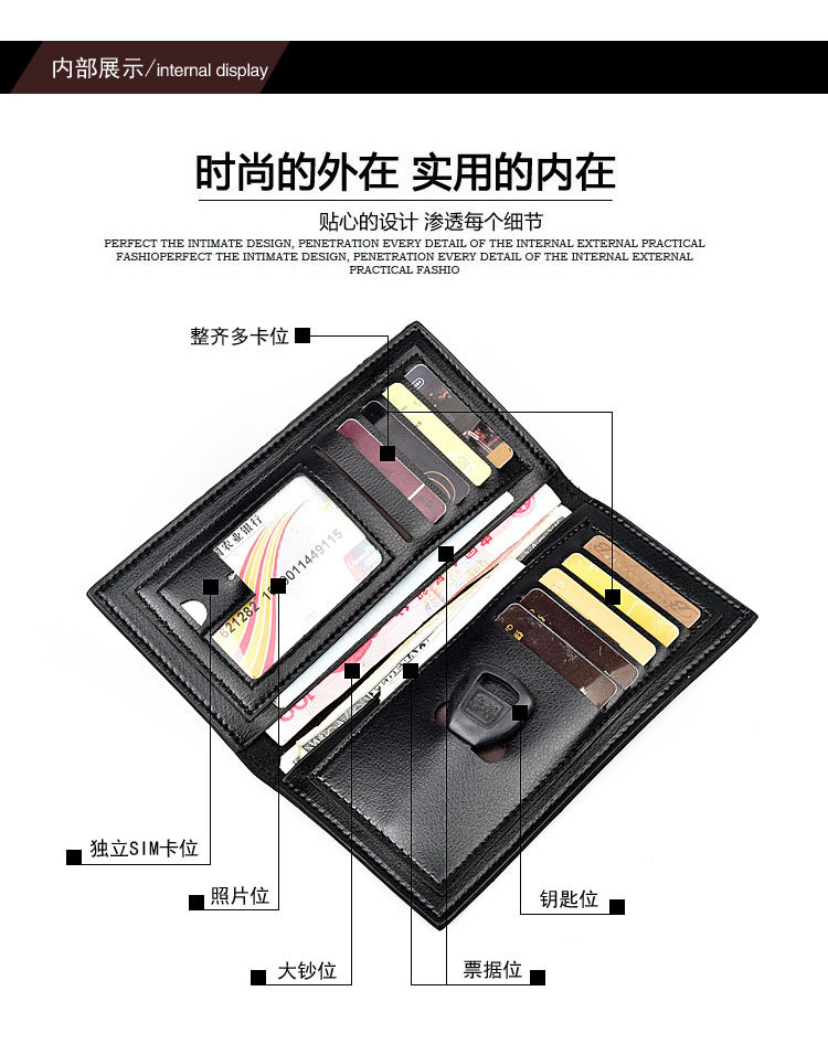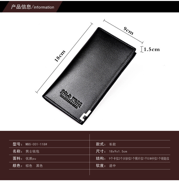 Men’s Clutch Fashion Long Wallet Size: 18*9*1.5CM Material: PU leather Packing: opp bag Color: black, brown Carton size: 40*60*67cm QTY: 500PCS