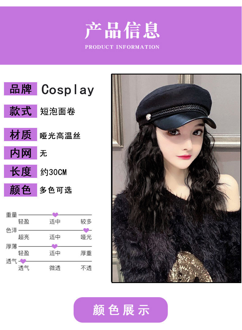 Detachable hat wig Size: 30CM Material: Matte high temperature silk Packing: OPP bag Color: mixed color Box gauge: 70*53*31CM QTY: 60PCS