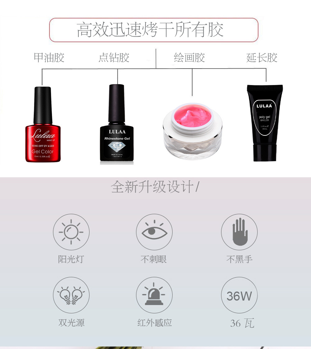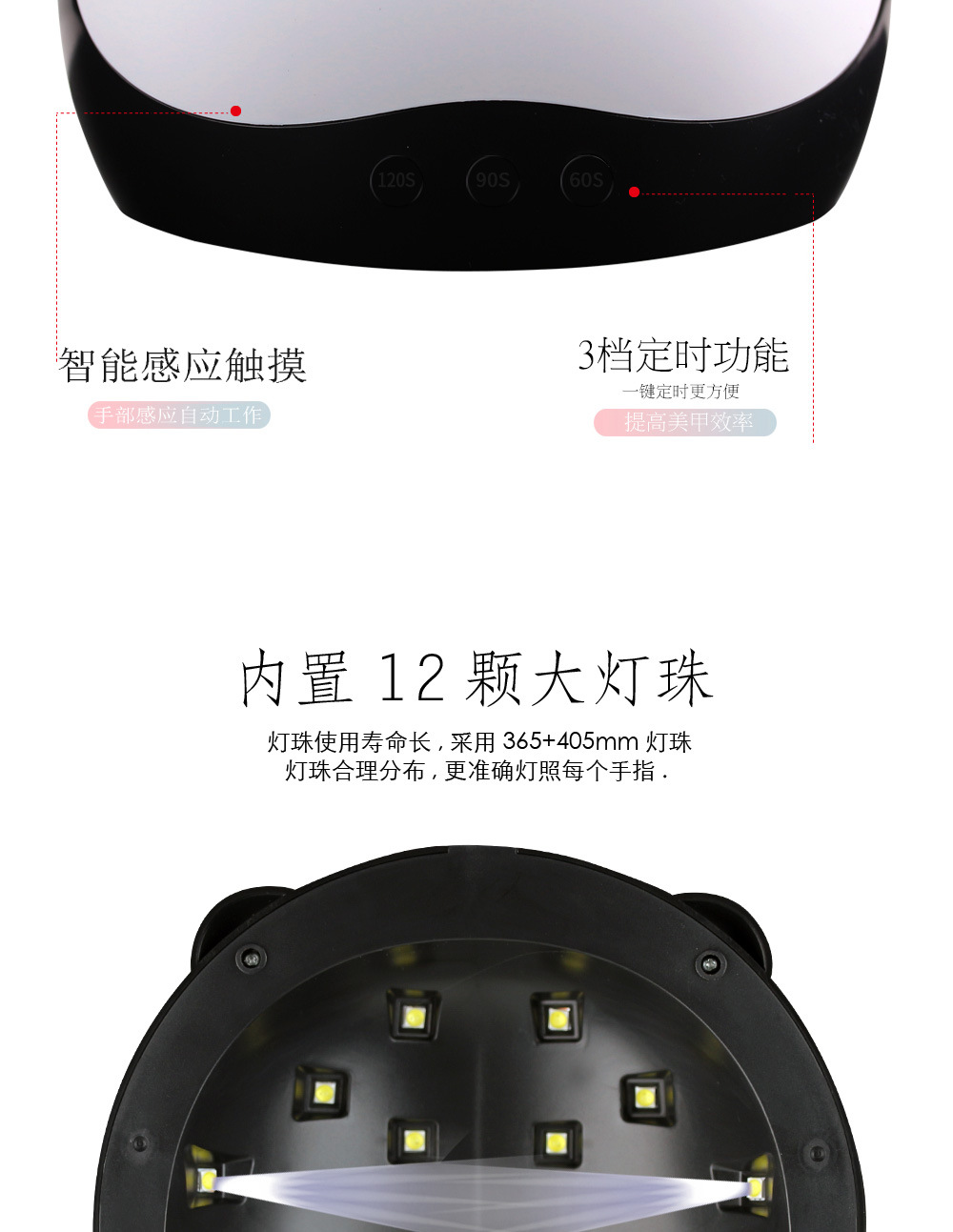 Nail polish glue phototherapy lamp Size: 182*118*67MM (201.2g) Material: ABS Power: 120W Packing: English packing Color: pink, white Box gauge: 79*41*45cm QTY: 50PCS
