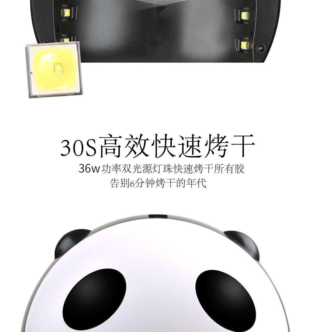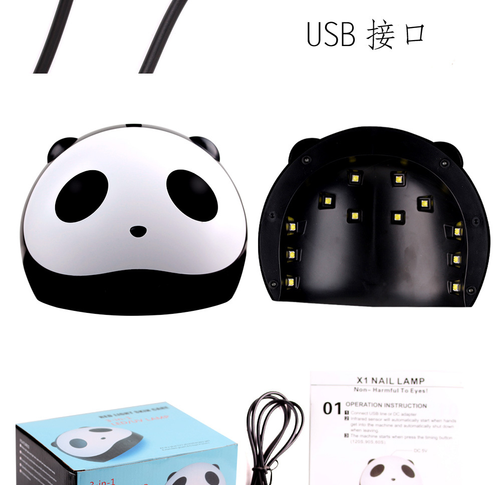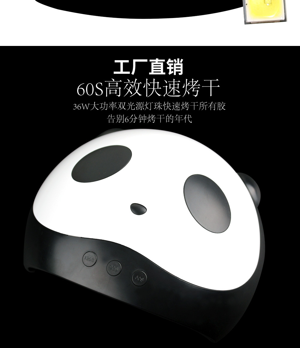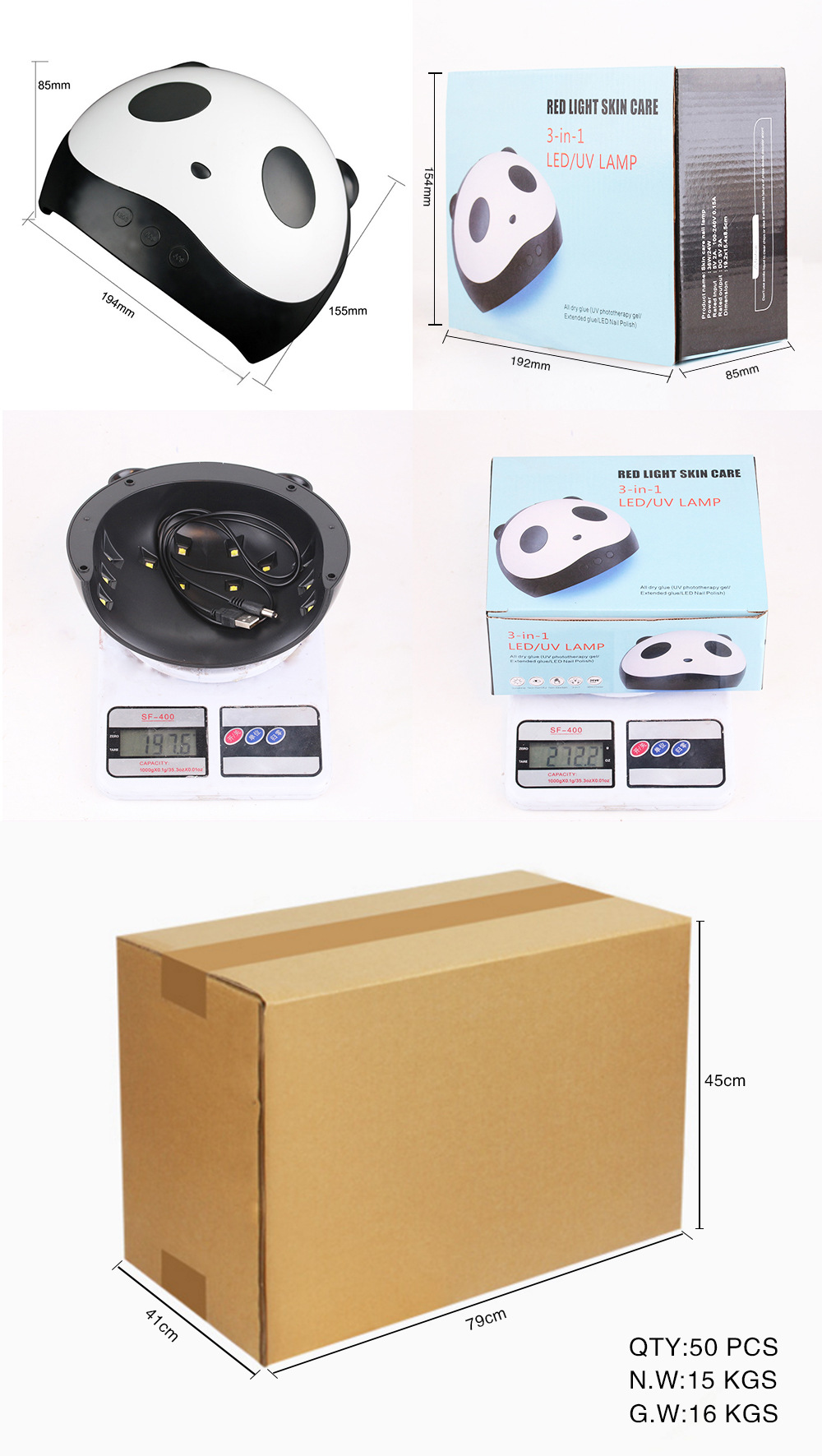 Panda Nail Lamp Size: 194*155*85mm (349g) Material: ABS Power: 36W Packing: English packing Box gauge: 79*41*45cm QTY: 50PCS