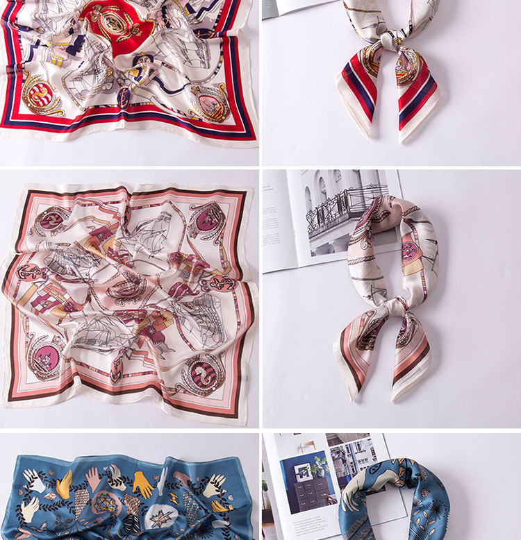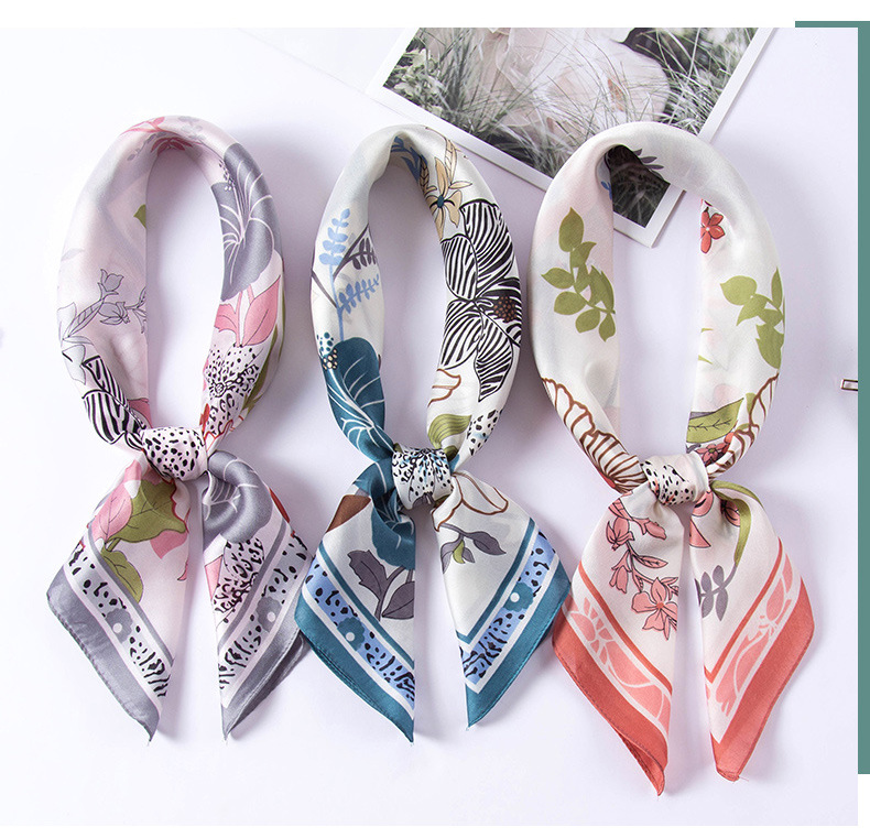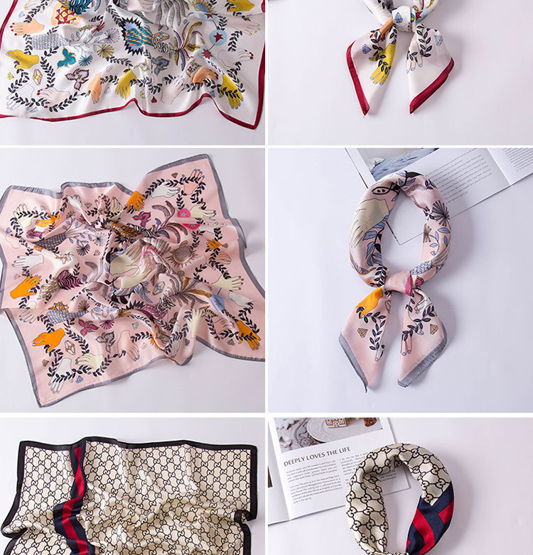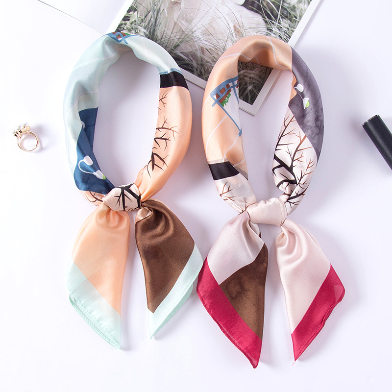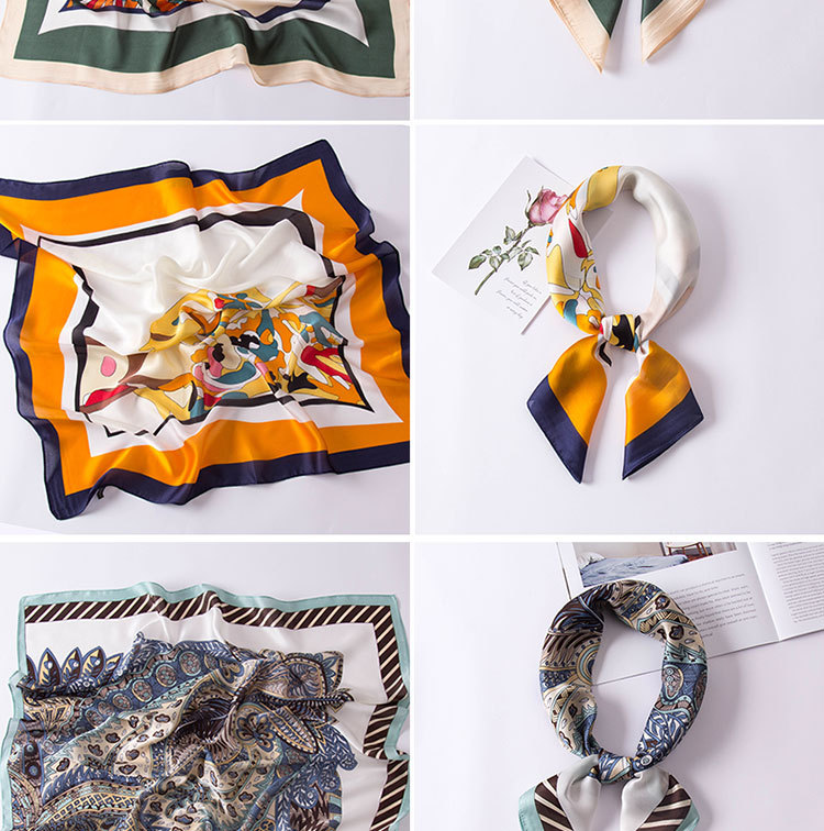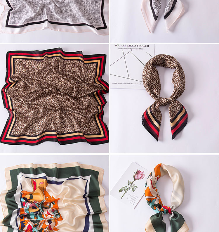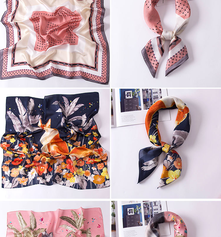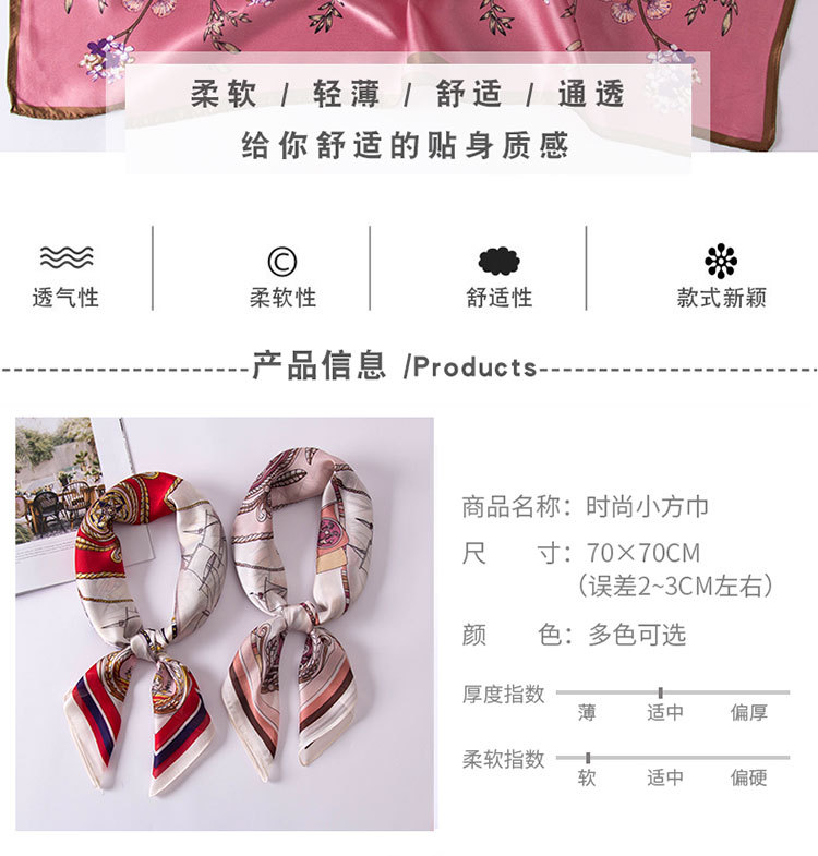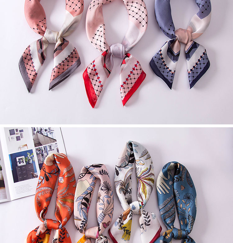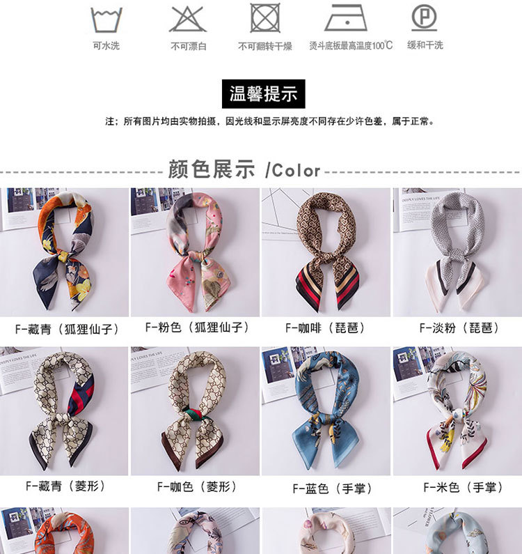 Printed scarf Size: 70*70CM Gram weight: 50g Material: artificial silk Packing: OPP bag Color: mixed color Box gauge: 77*62*37CM QTY: 500PCS
