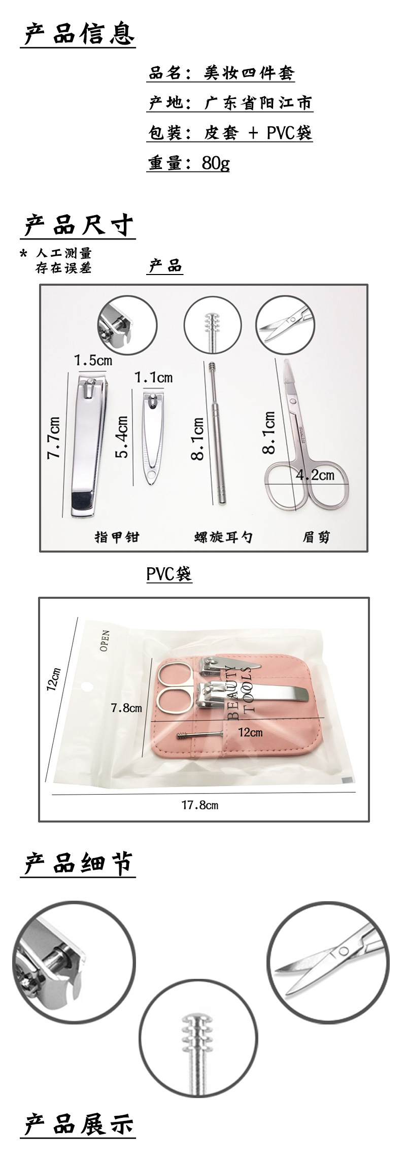 Trimming Nail Set Size: 17.8*12*7.8CM Material: Stainless steel Packing: PVC bag Color: black, pink Box gauge: 34*22*24CM QTY: 300PCS