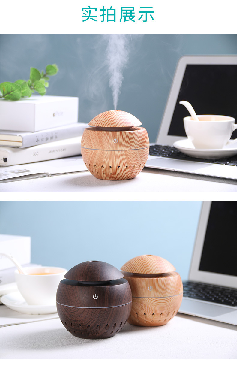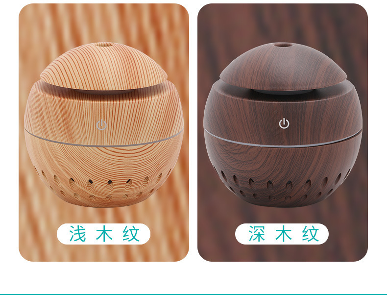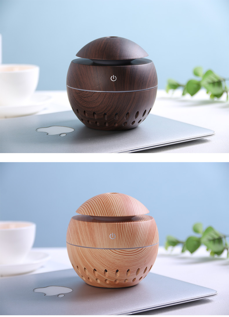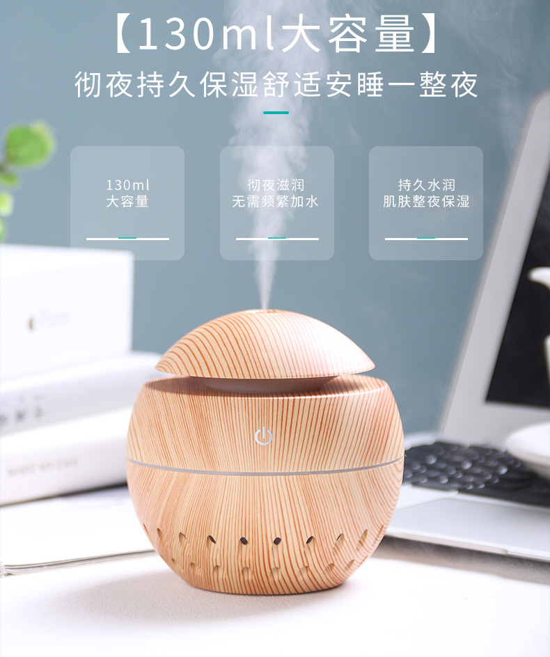 130ml aroma diffuser hollow Size: 100*105MM Power supply: 5V Power: 2W Water capacity: 130ML Material: ABS Packing: Kraft paper box Color: dark, light