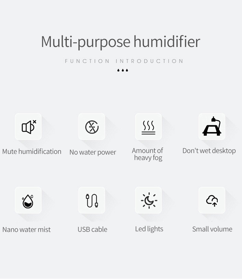 Household mini humidifier Size: 110*110*119mm Capacity: 1 liter Material: ABS+pp Packaging color box