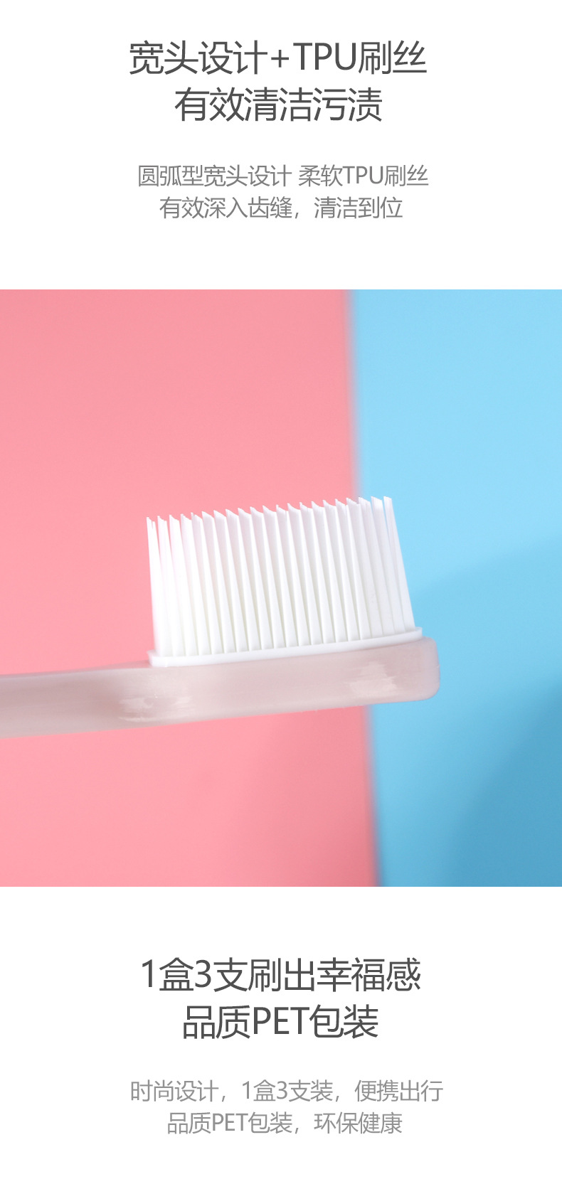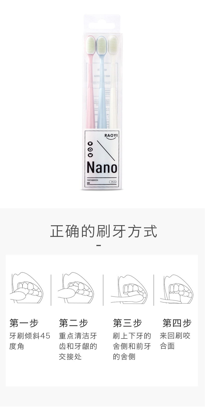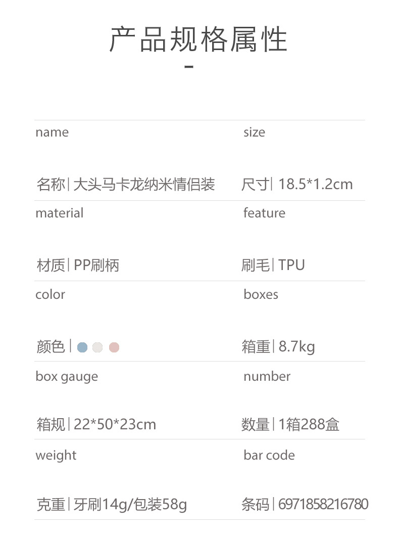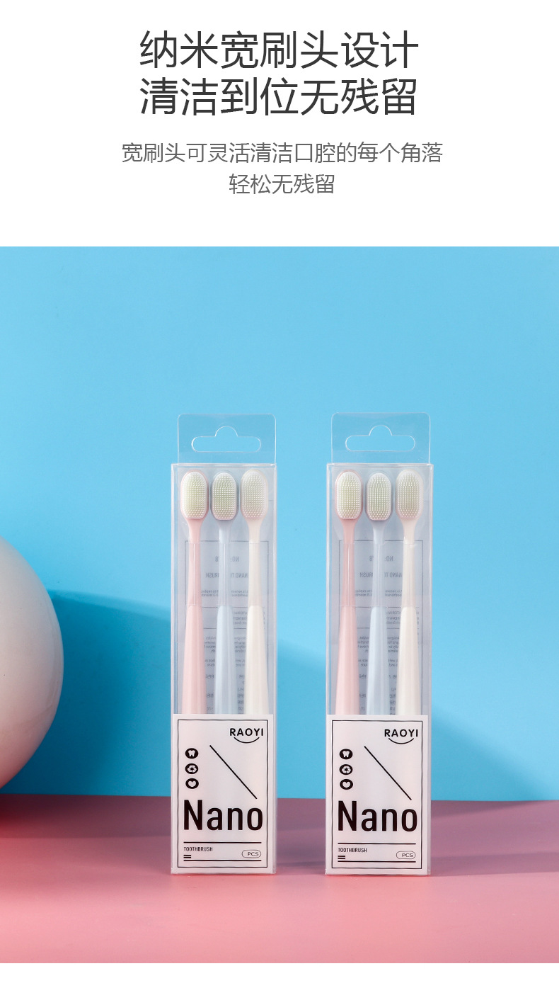 Macaron Toothbrush Nano 3pcs Size: 18*1.2CM Material: pp +TPU Packing: PVC box Box gauge: 22*50*23CM QTY: 288PCS