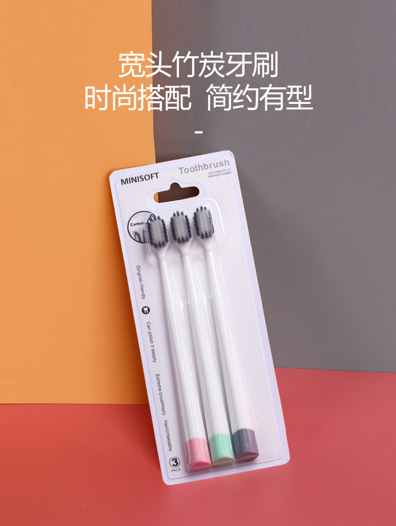 3 plain wide-head toothbrushes Size: 19*1.8CM Material: PETG/PBT Packing: Blister cardboard Color: mixed color