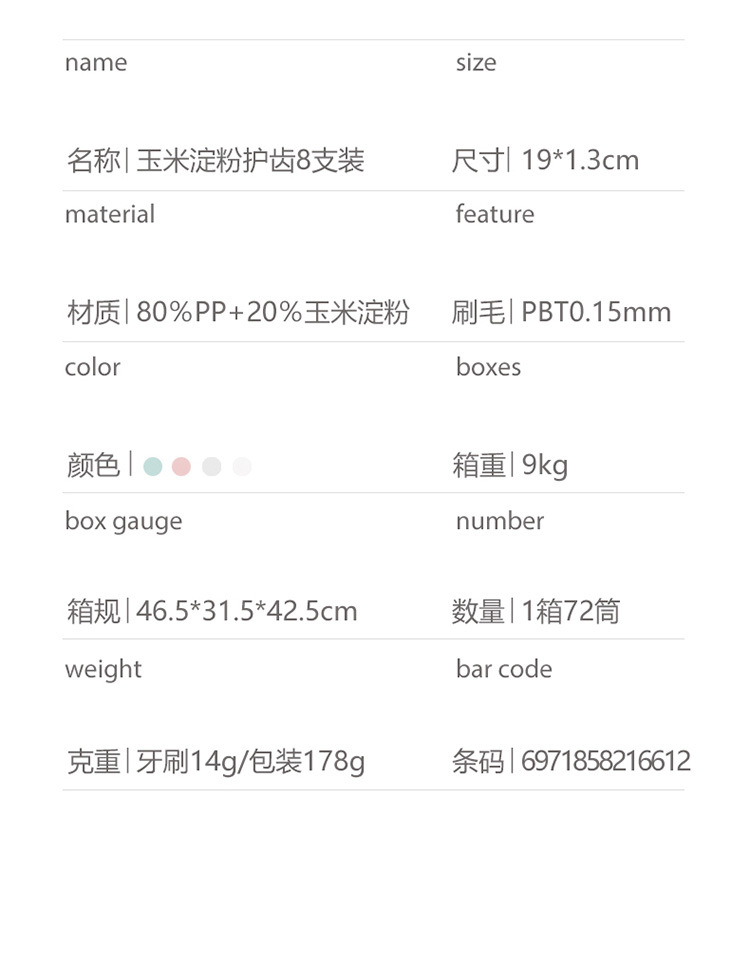 Simple 8 toothbrushes in a storage bucket Size: 19*1.3CM Material: soft wool PBT/PP Packing: PVC drum Color: mixed color Box gauge: 46.5*31.5*42.5CM QTY: 72PCS
