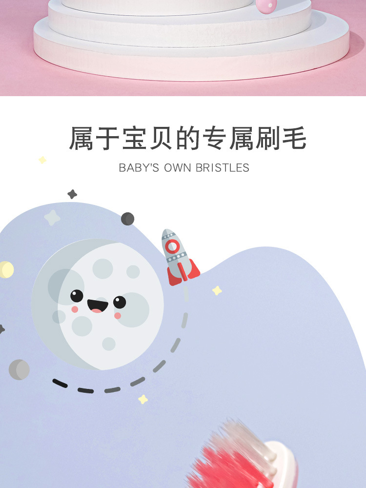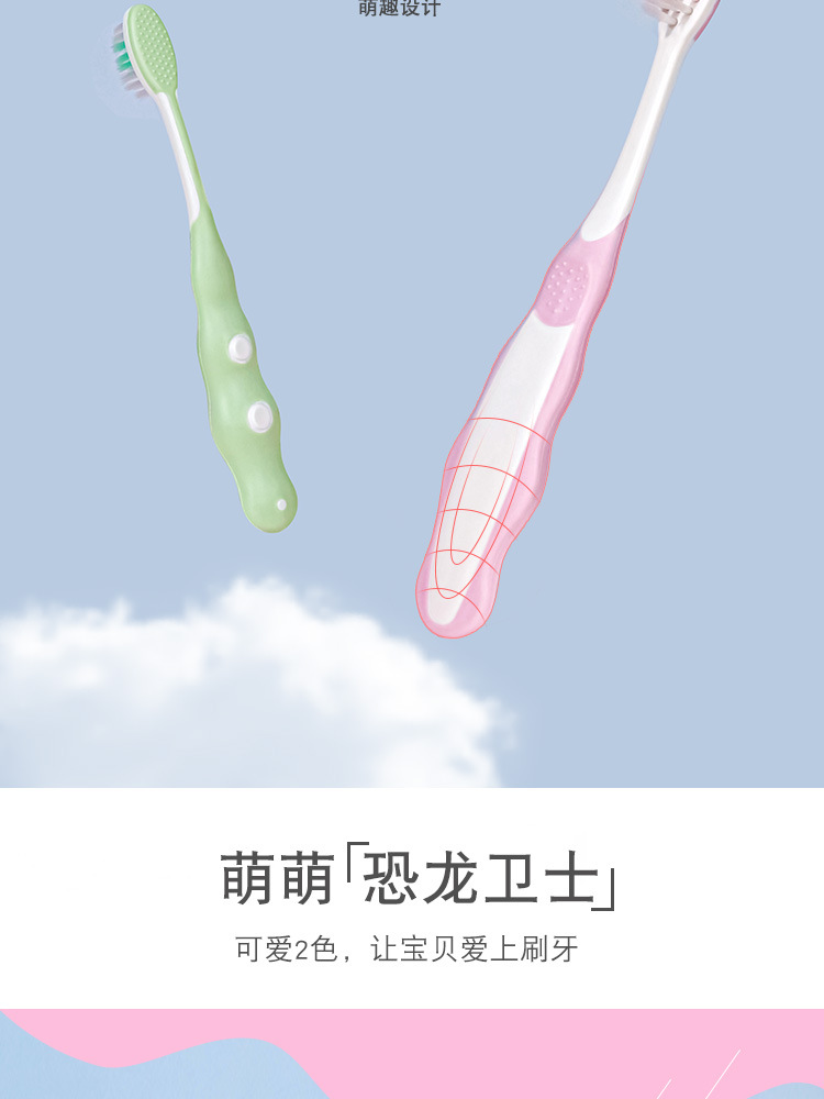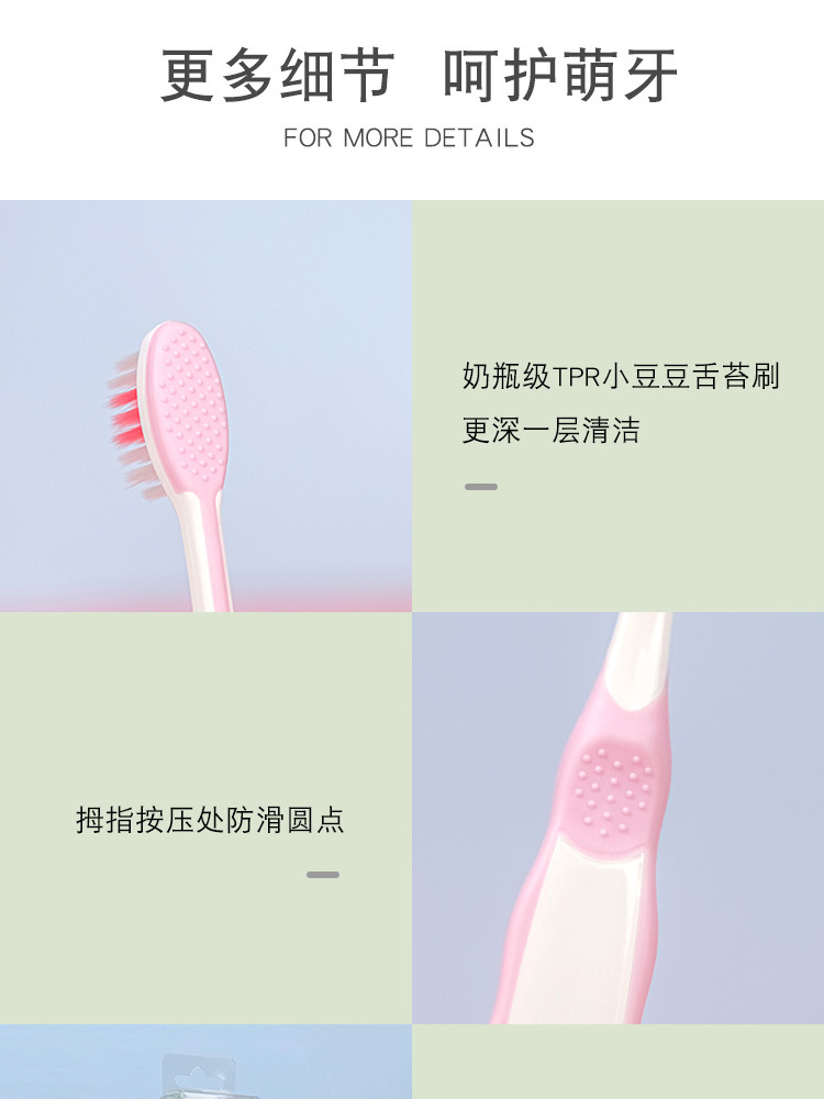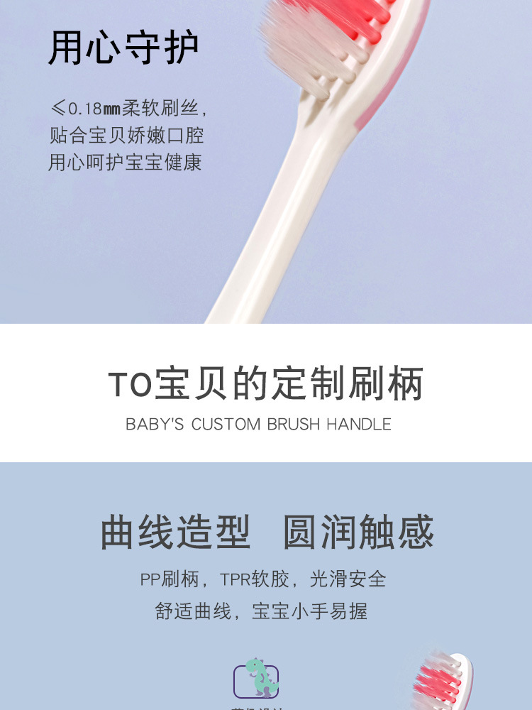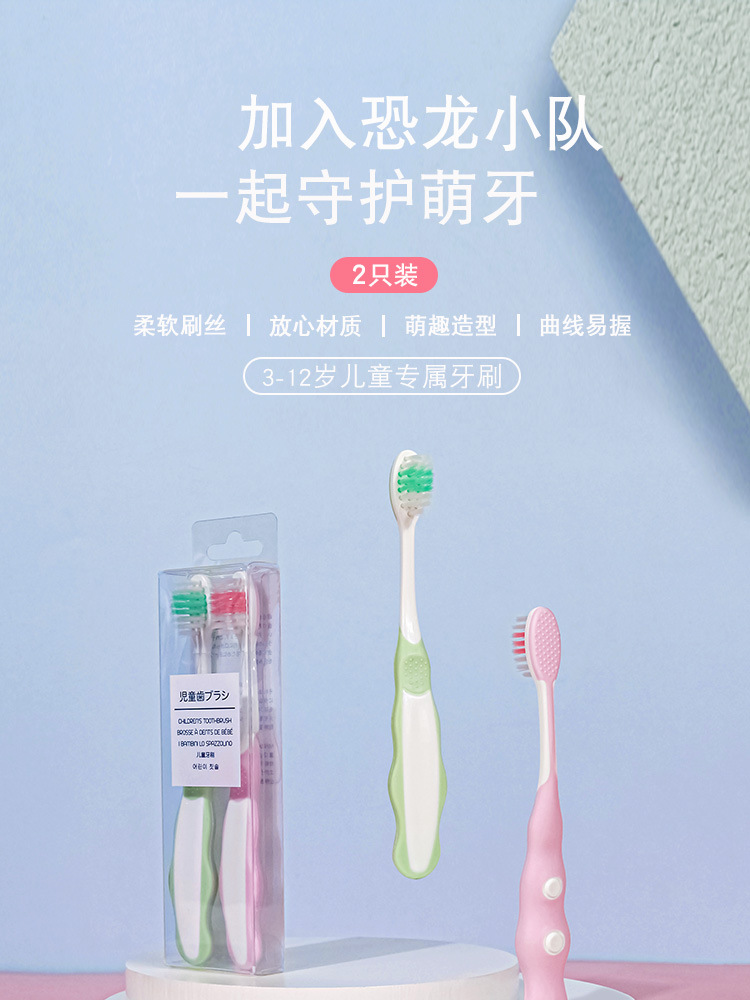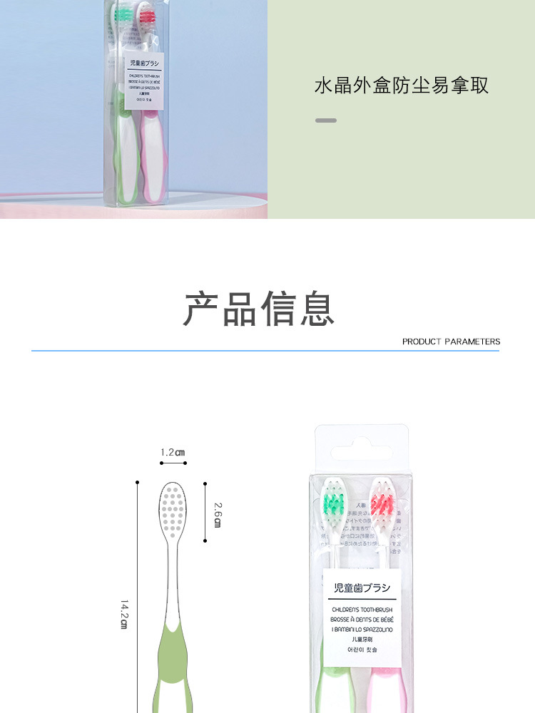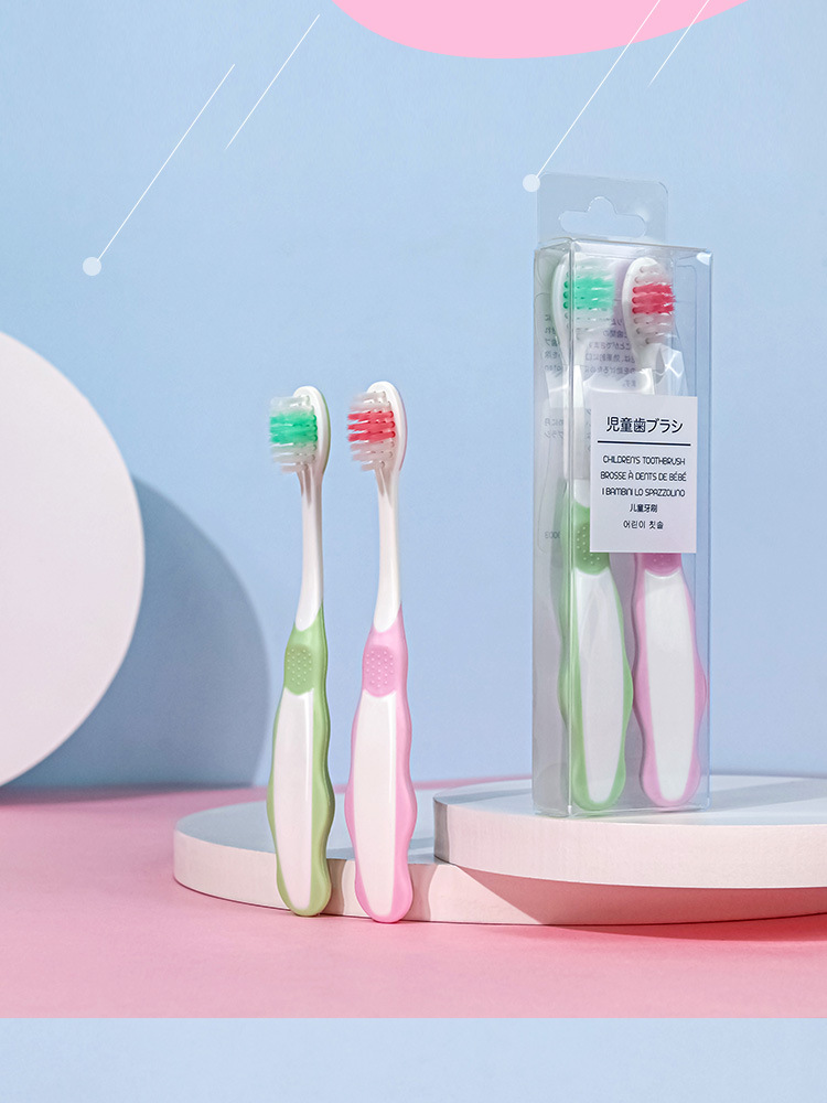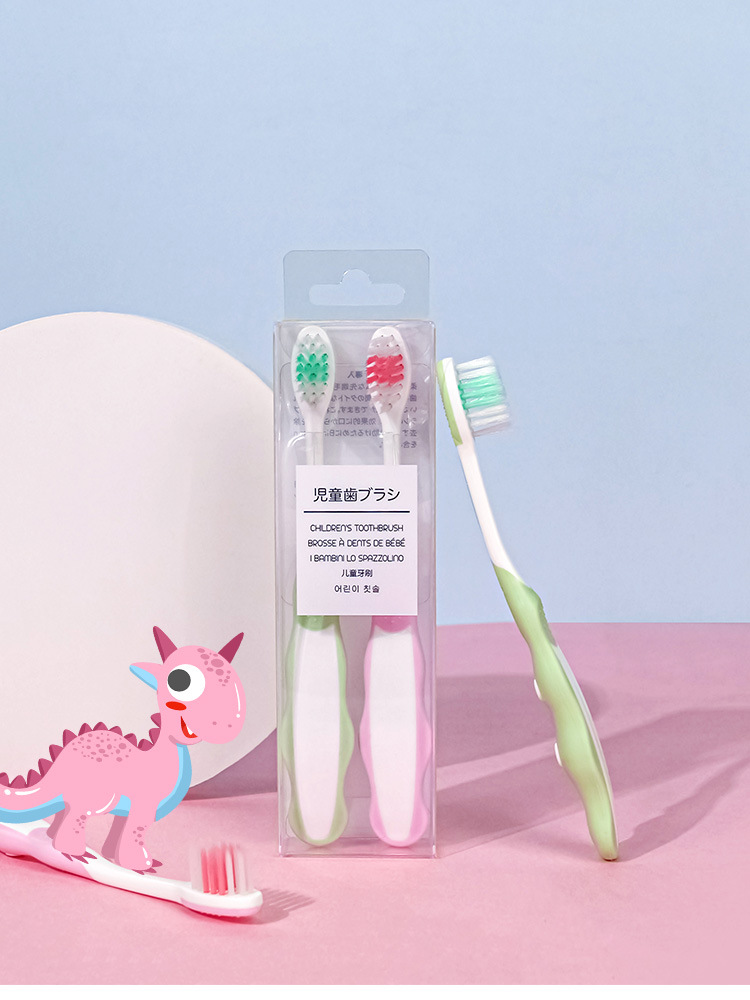 Simple children’s toothbrush with 2 soft bristles Size: 14.2*1.2CM Material: PP/TPR Packing: PVC box Color: mixed color
