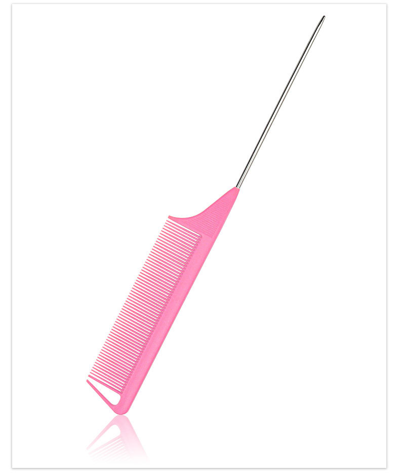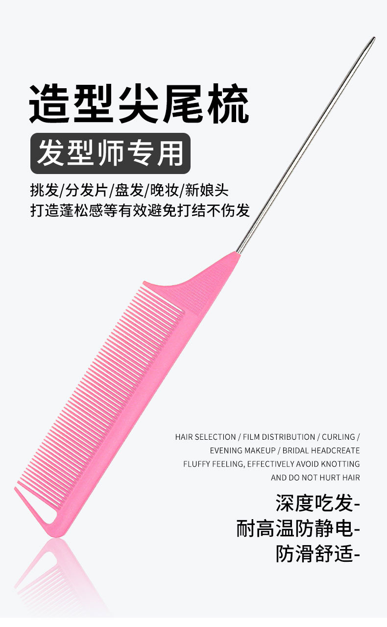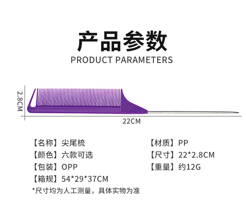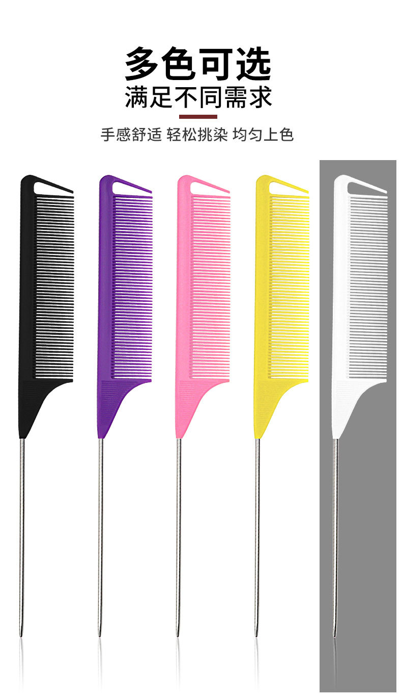 Colored steel tip tail comb Size: 22*2.8CM Material: PP Packing: OPP bag Color: mixed color Box gauge: 54*29*37CM QTY: 1200PCS