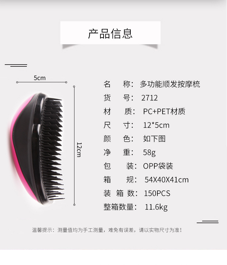 Multifunctional hair massage comb Size: 12*5CM Material: PC+PET Packing: OPP bag Color: mixed color Box gauge: 54*40*41cm QTY: 150PCS