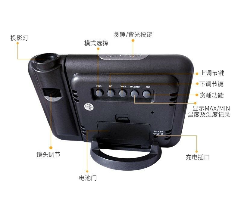 Weather forecast 8190 projection clock Size: height 10.5cm*width 14.5cm*thickness 6CM Material: plastic + electronic components Packing boxes Color: white, black, white Packing: 60pcs