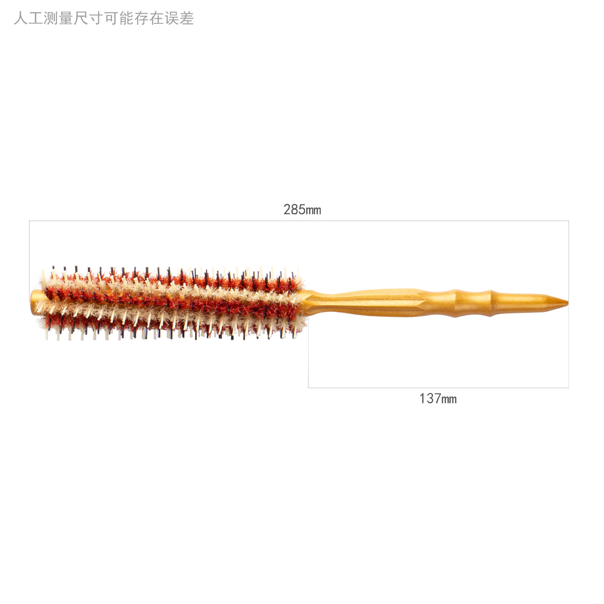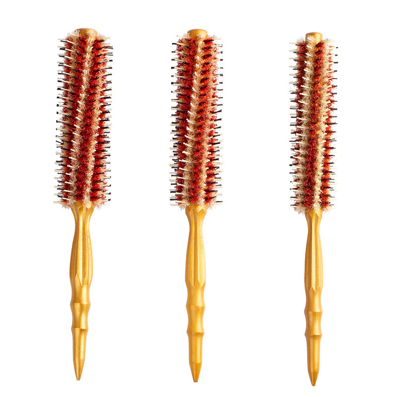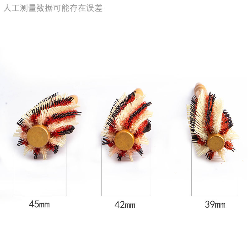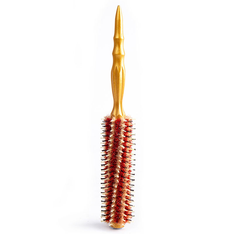 Golden high temperature resistant solid wood bristle comb Size: 285*Φ45/42/39mm Material: Hemu+aluminum tube+nylon+bristle Packing: OPP bag Box gauge: 47*42*54CM QTY: 120PCS