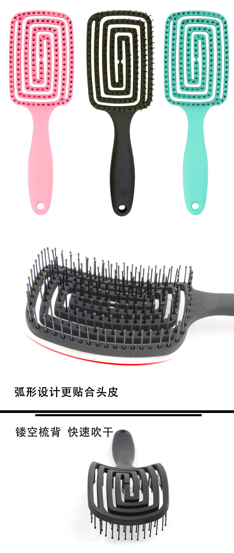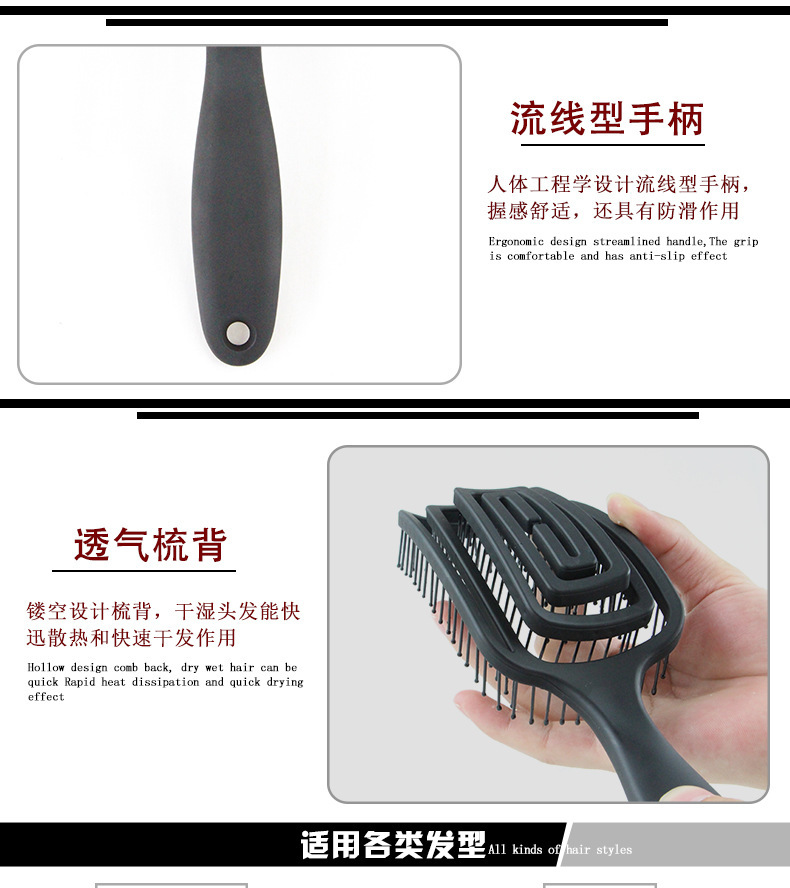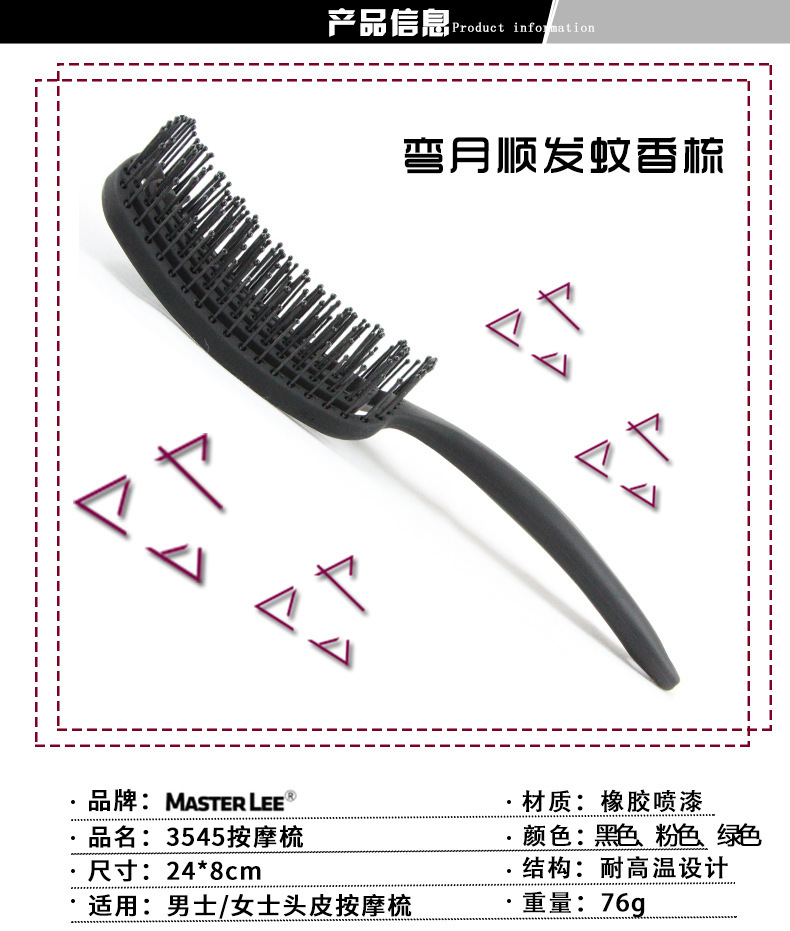 Massage comb Size: 24CM*8CM material: plastic Packing: Single OPP bag packing Color: black/pink/green/purple Box gauge: 70*47*30CM QTY: 200PCS
