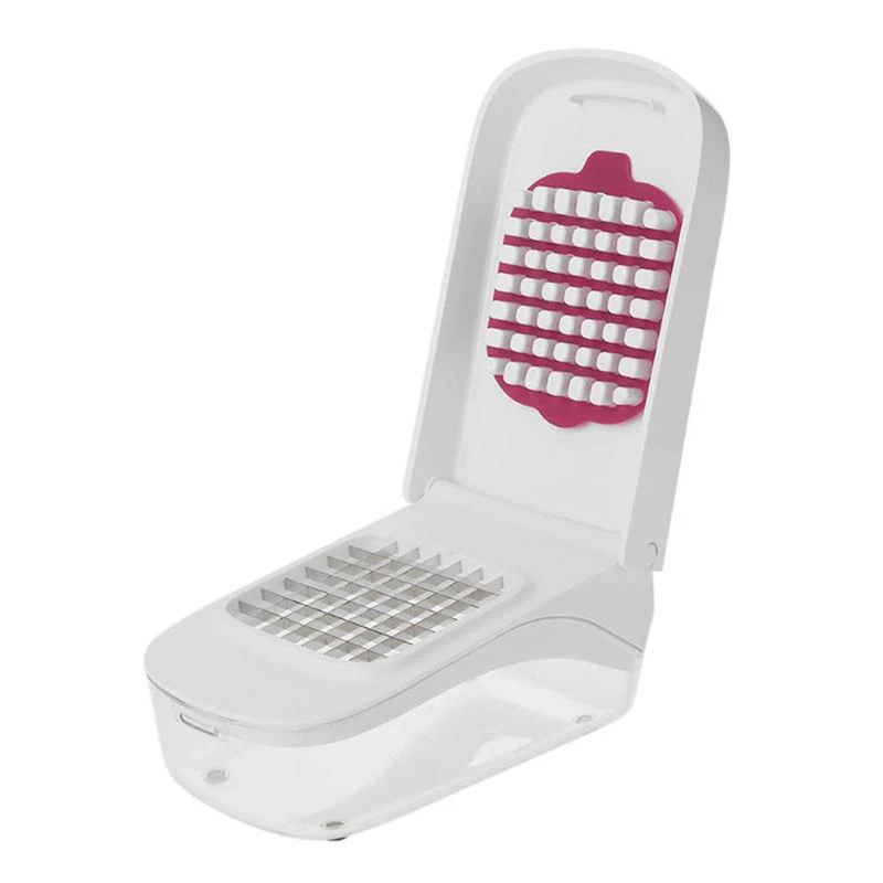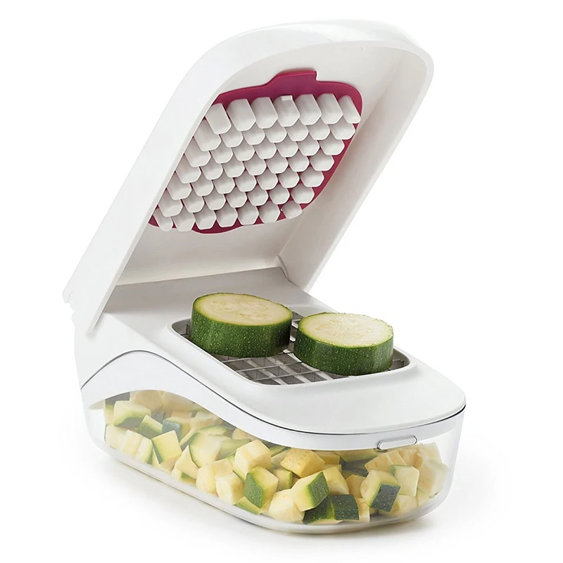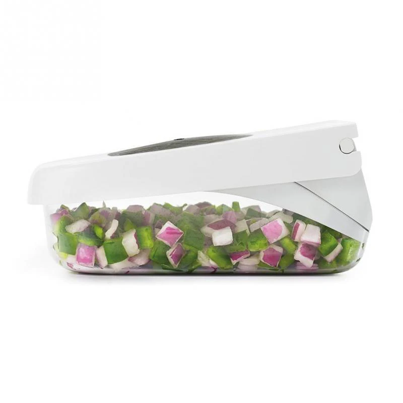 Kitchen cutter can chop onions, zucchini, peppers, celery, tomatoes, hard boiled eggs, cheese, and fruits. You can clearly watch the process how ingredients is transferred instantly from the cutting surface into the bowl below. There’s no hassle, and no mess!