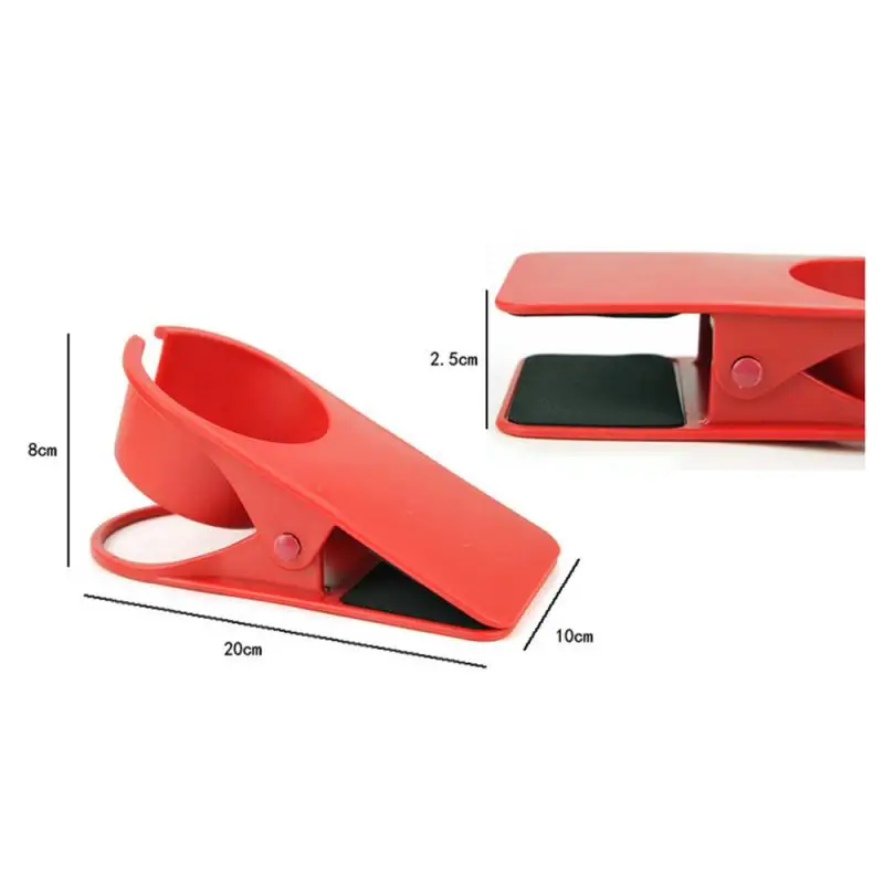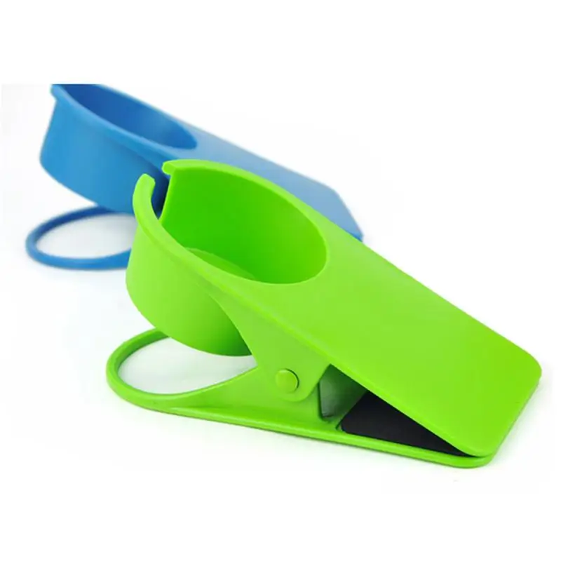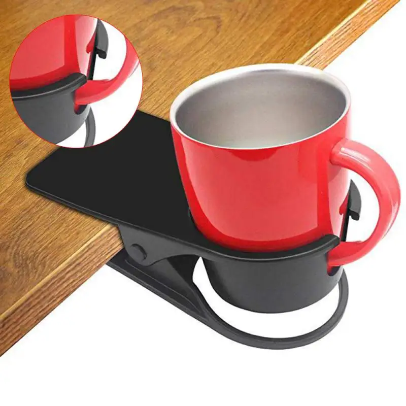 Try this cup holder. It uses clamps to connect your desktop. The installation is very simple. You don’t need the tools like screws and hammers. Just clamp it on the table.
