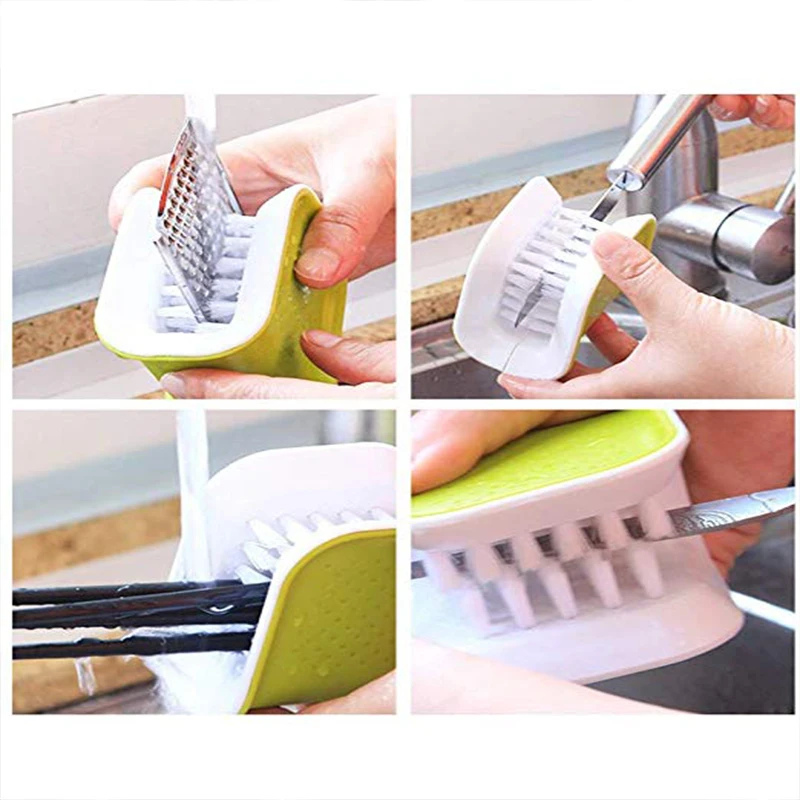 4,Unique Design: Our cutlery cleaning brush is wrap-around design cleans both sides at once, keeps your fingers away from any sharp edges and textured grip ensures it won’t slip when in use, and it is fun to use and quicker to clean. Cleaning sharp cutter and cutlery is much safer.
