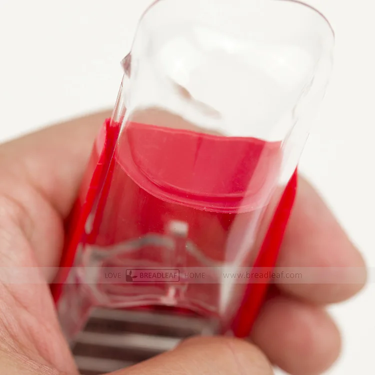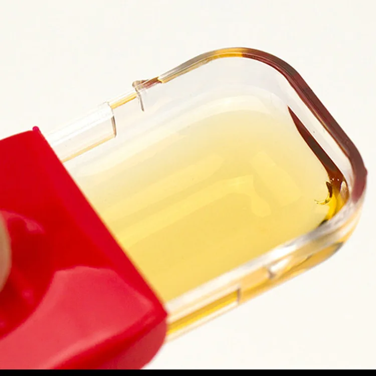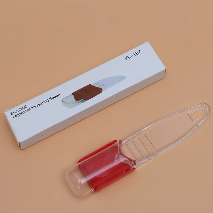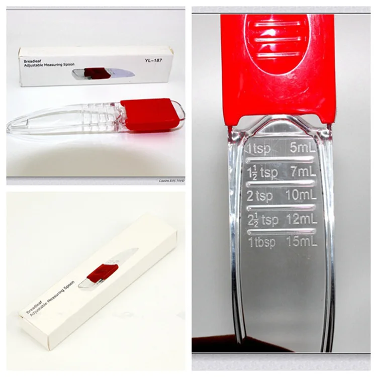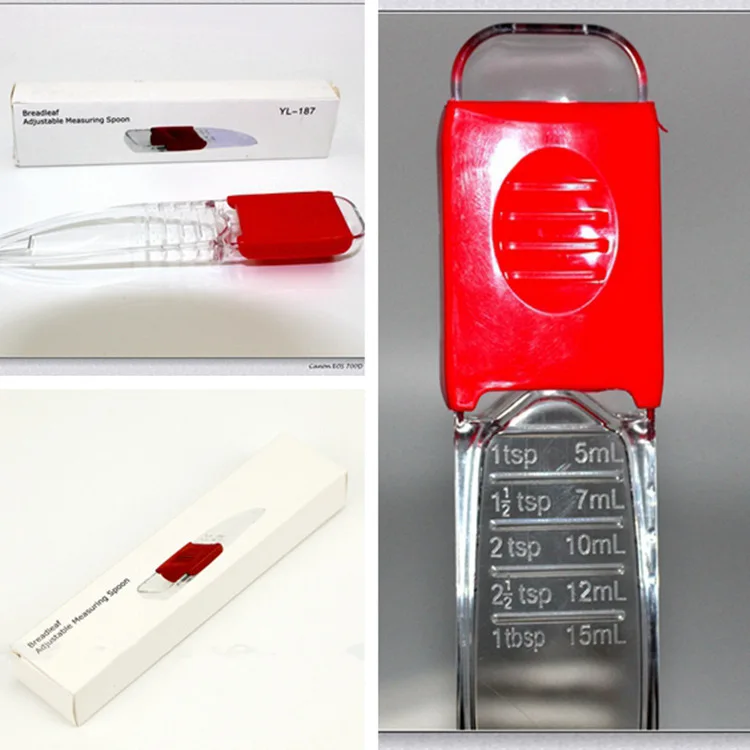 Product Description: A measuring spoon with adjustable capacity. You can adjust the required capacity according to your needs. The front end pours in the required liquid. The front end of the red part has a sealing strip that will not let the liquid leak out. The red button has anti-slip protrusions to increase the friction and not slip.