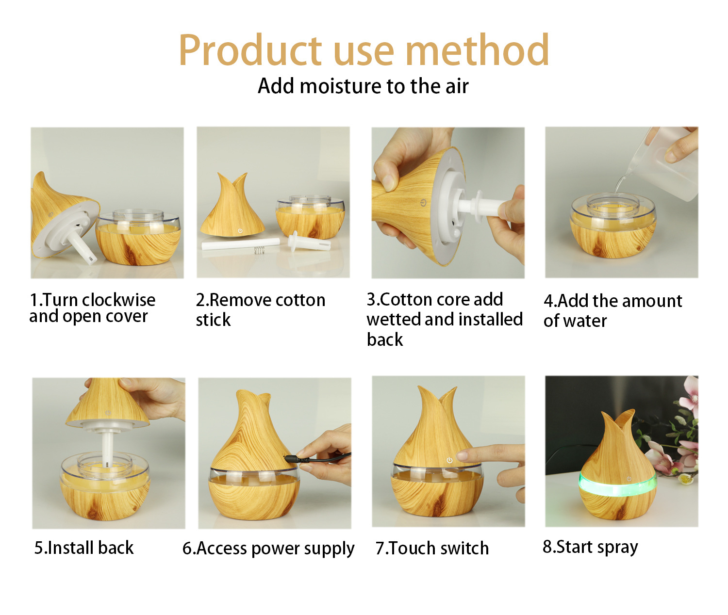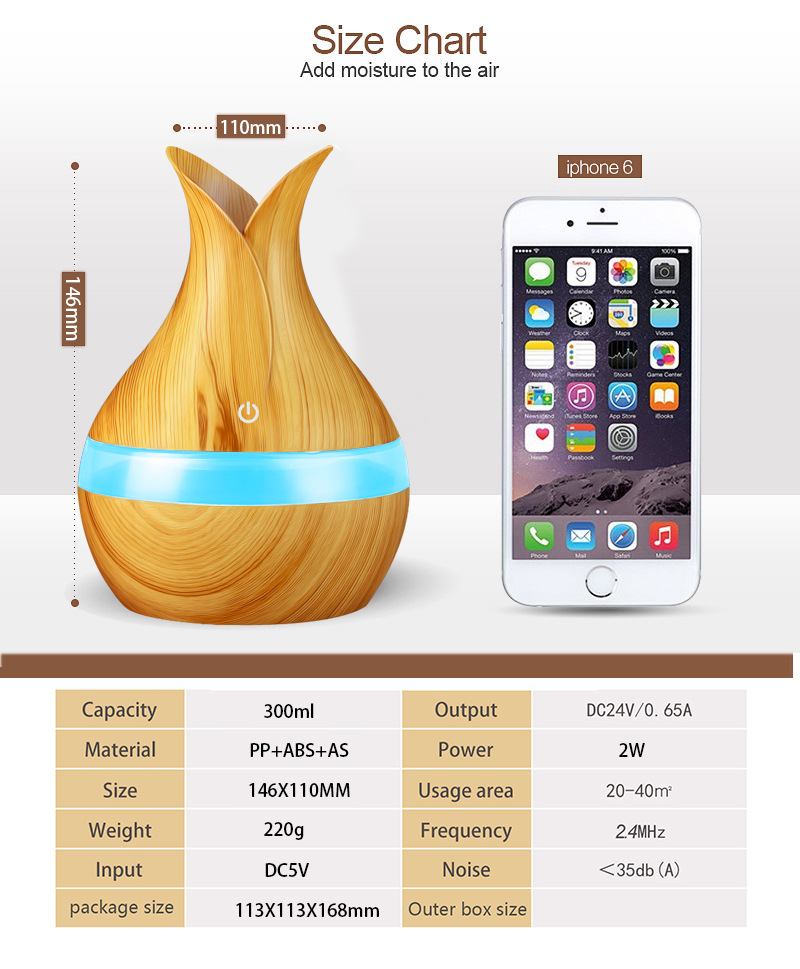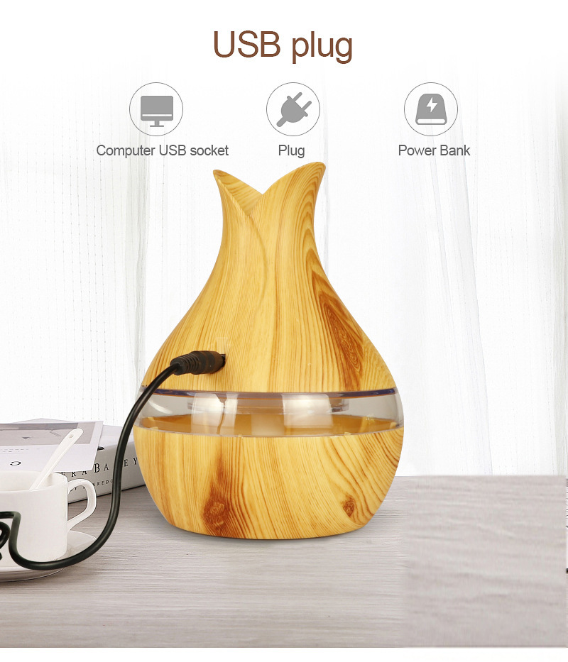 Wood grain humidifier household 300ml wood grain aroma diffuser Size: 146*110MM Capacity: 300ml Power: 2w Material: pp+ABS+AS Packing boxes Color: light wood grain, dark wood grain,