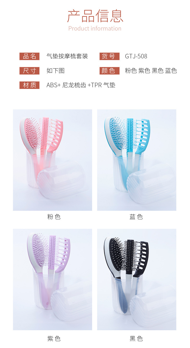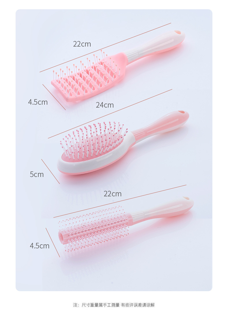 Three-piece color hairdressing comb Size: 22*4.5CM 24*5CM 22*4.5CM Material: ABS+TPR Packing: transparent box Color: mixed color Box gauge: 62*42*54cm QTY: 48PCS