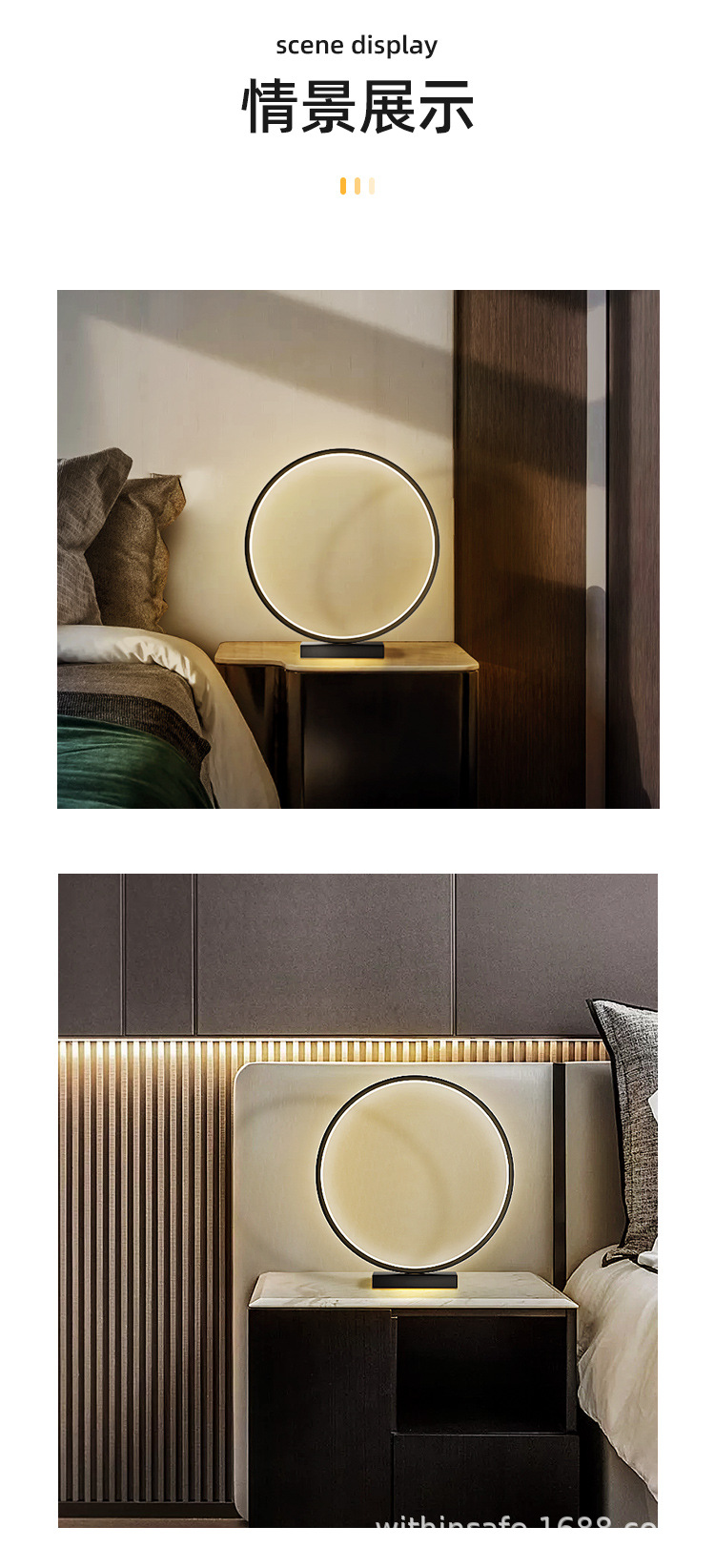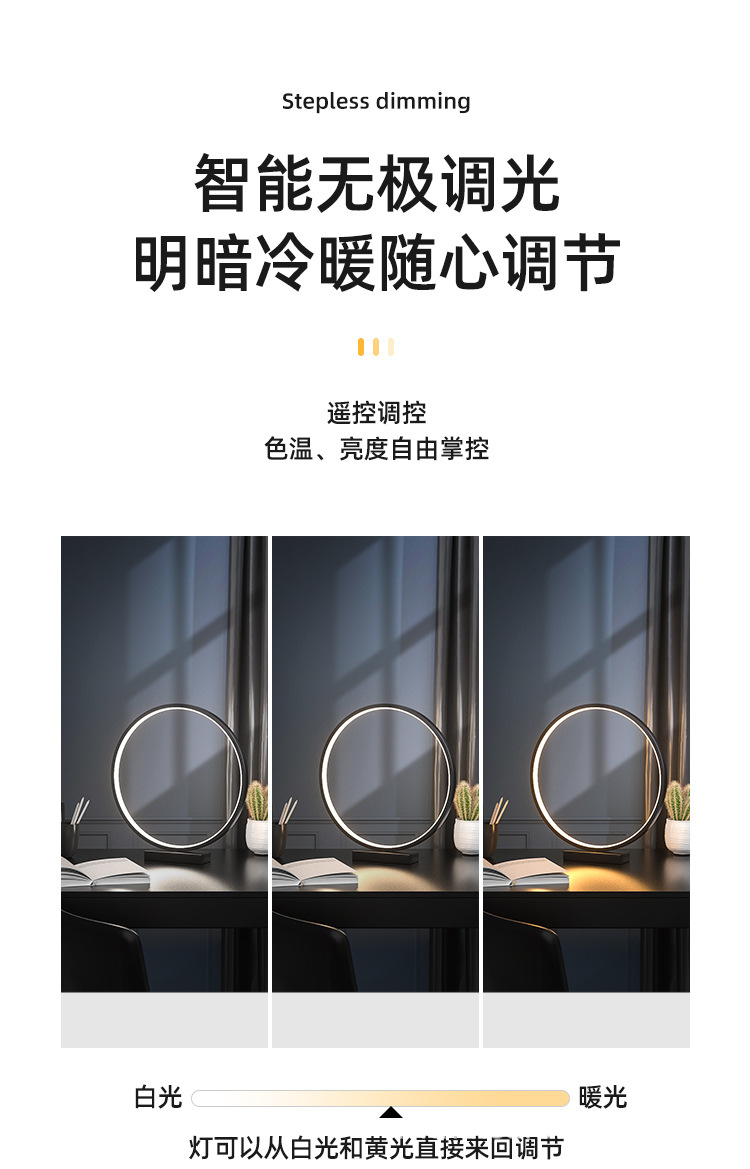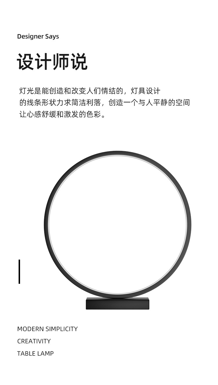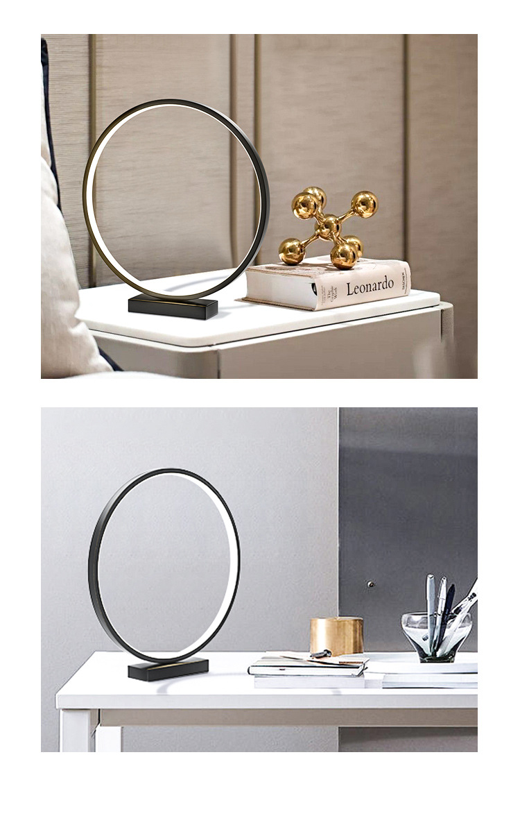 Round modern minimalist led desk lamp Size: 30*6*32.5CM Material: PVC Light source power: white light, warm white, warm light (W) Input voltage: 12 (V) Carton size: 45*32.5*35.5CM QTY: 6PCS