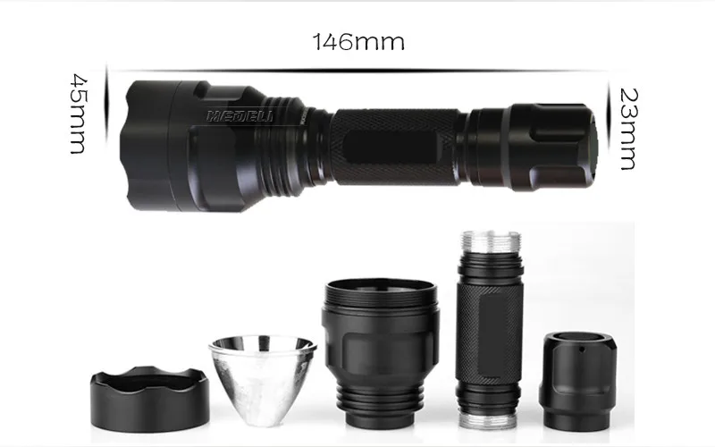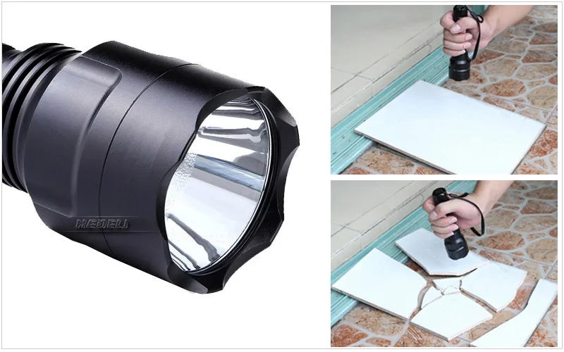 - Boasts a peak beam intensity of 10000cd and a throw distance of up to 400-500 meters (CREE XML T6 400 meters CREE XM-L2 500 meters