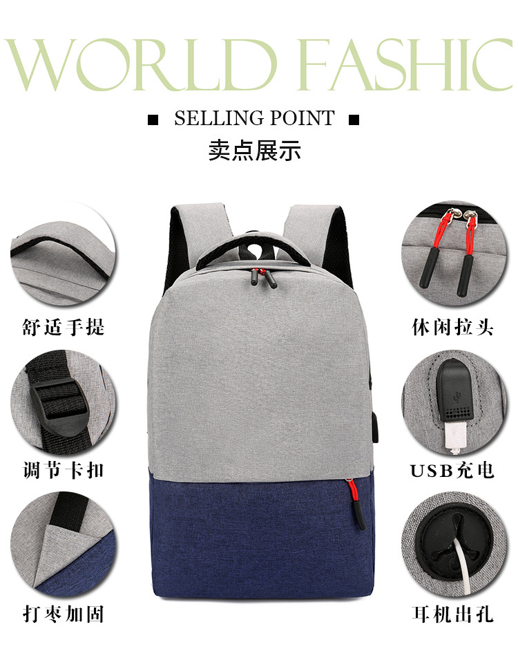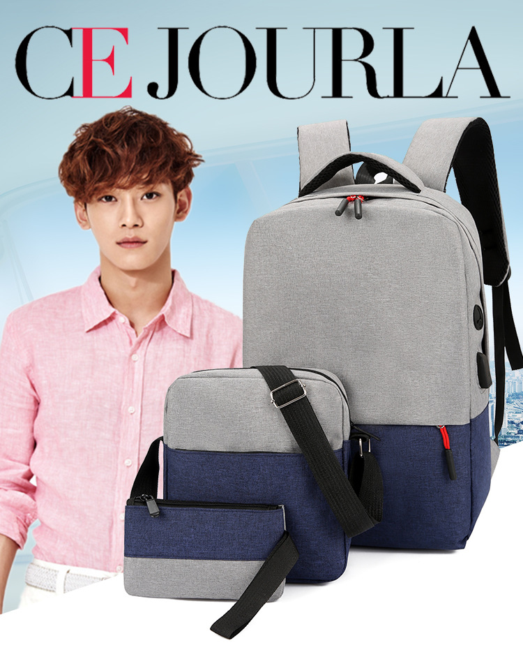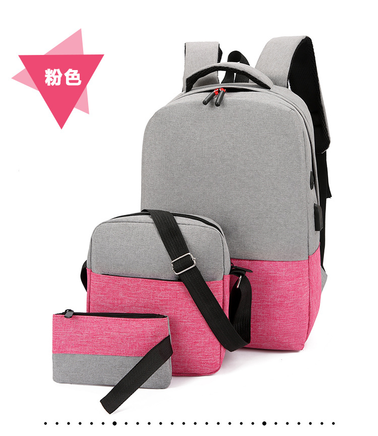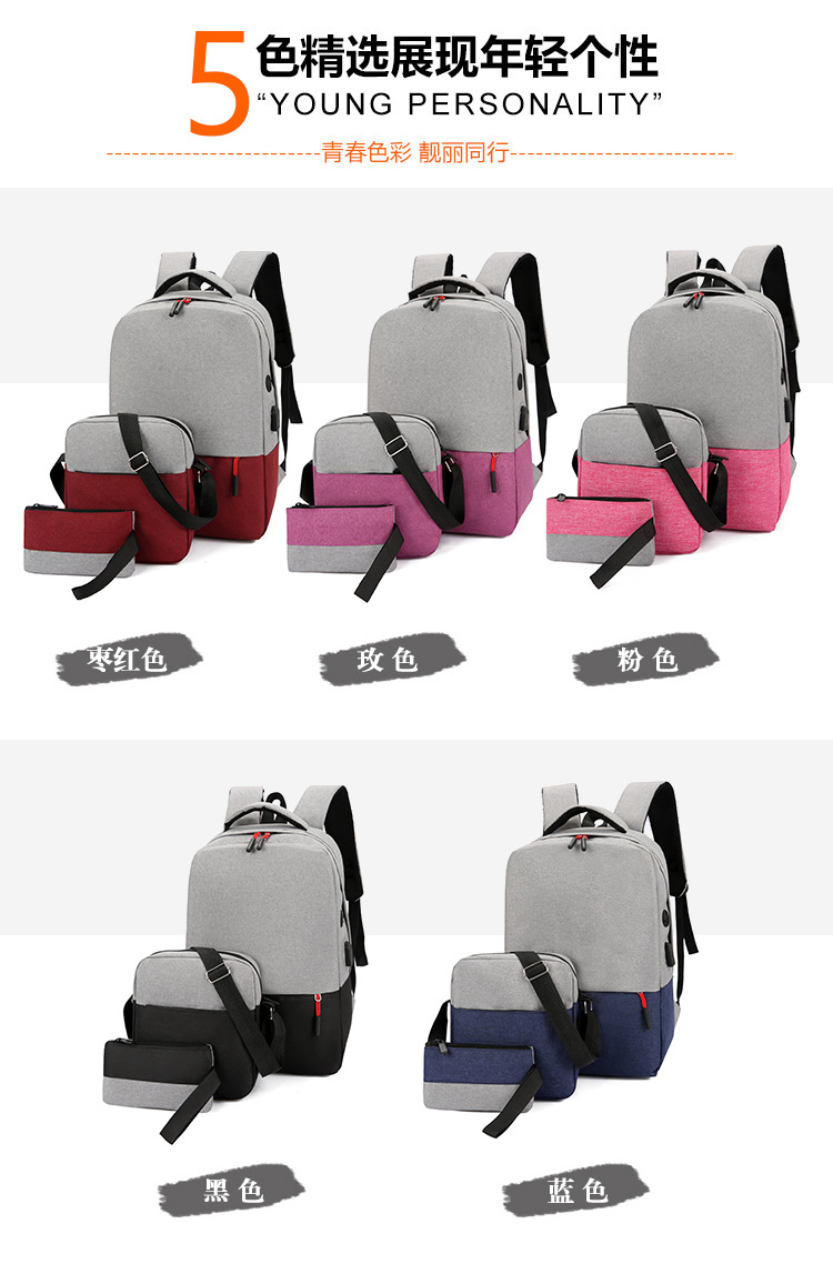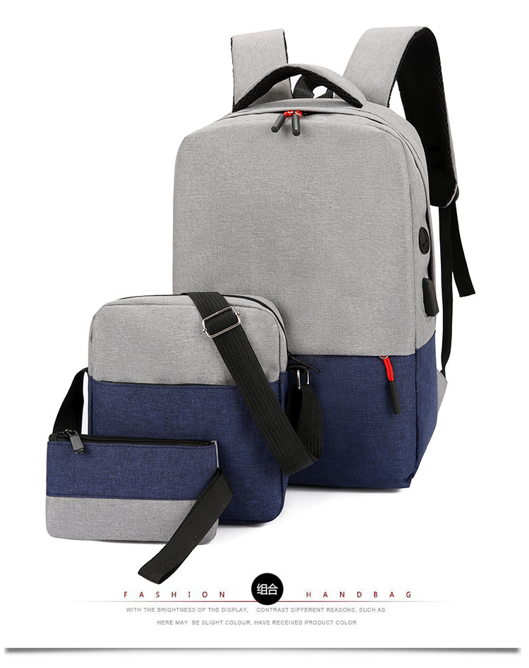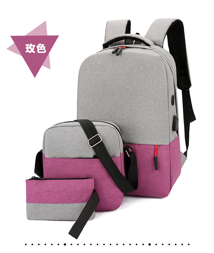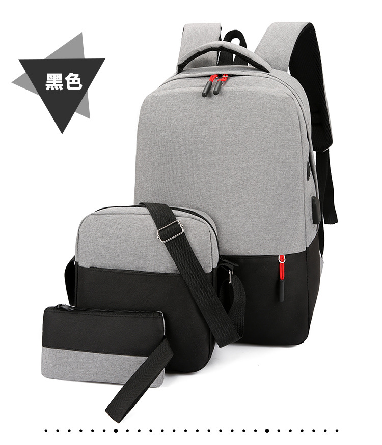 USB interface design large-capacity backpack/three-piece Design: USB interface, headphone jack design Size: Big bag: height/width/thickness: 45*30*15cm Material: Polyester Lining fabric: Nylon Weight: 0.49kg Color: black, gray, red, blue Box gauge: 70*40*75CM QTY:50PCS