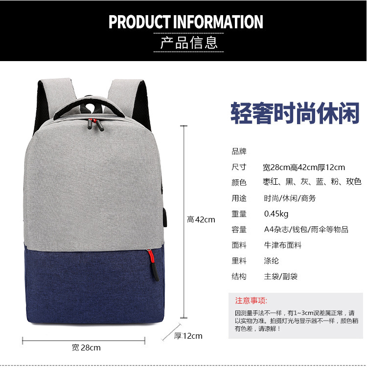 Casual backpack Size: 48*30*18CM Material: Oxford cloth Packing: OPP bag Color: black, gray Box gauge: 50*60*70CM QTY: 40PCS