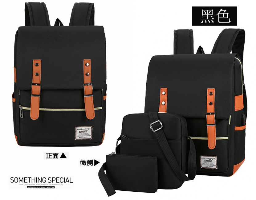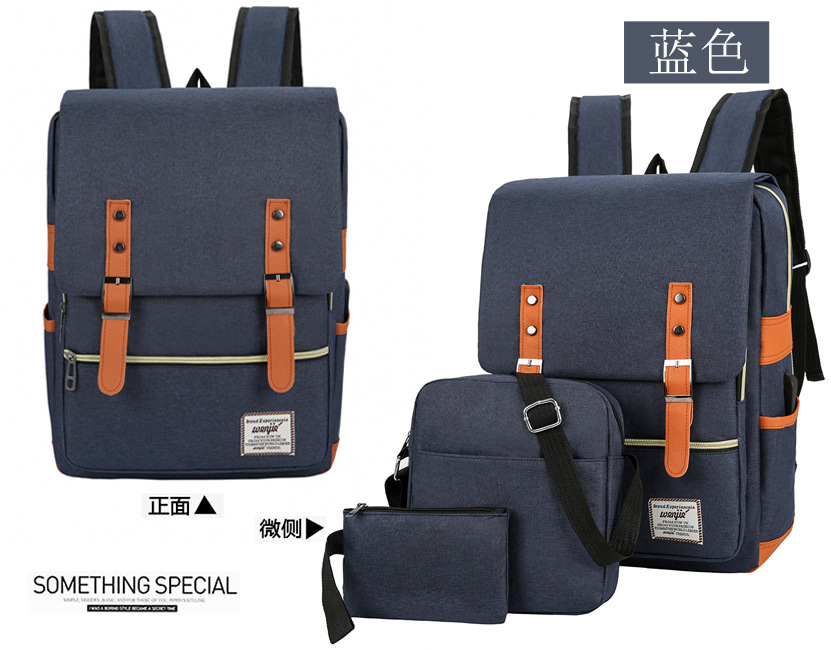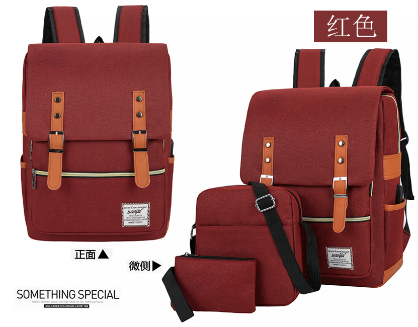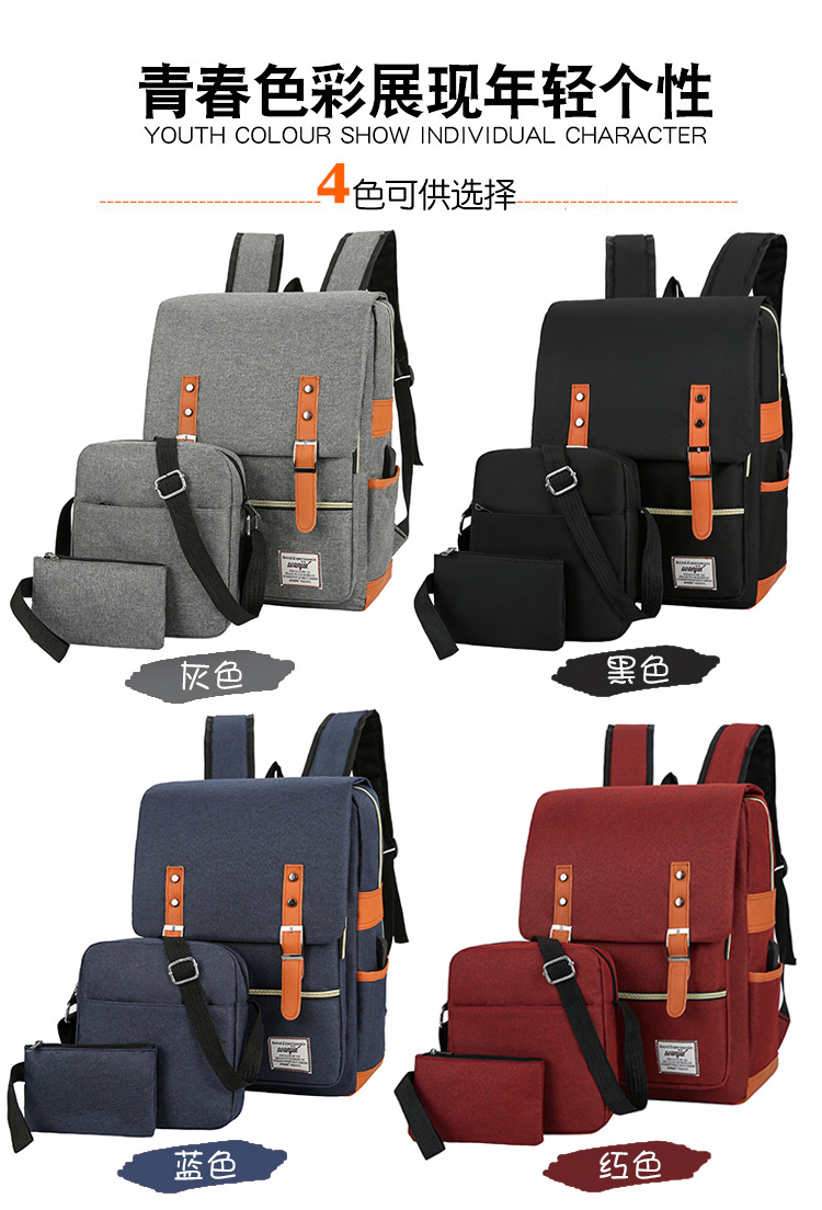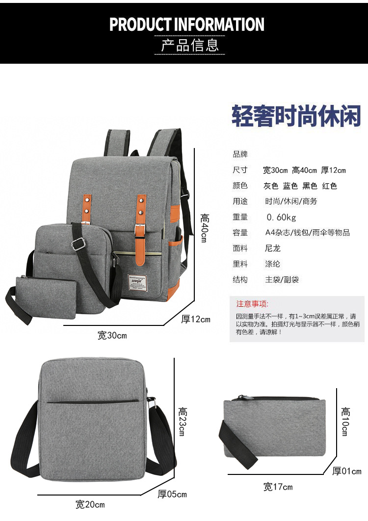 Three-piece computer backpack Size: Big bag 40*30*12CM, middle bag 23*20*05CM, small bag 10*17*01CM Material: nylon + polyester Packing: inner patch pocket Color: red, blue, black, gray Box gauge: 70*40*75CM QTY:50PCS